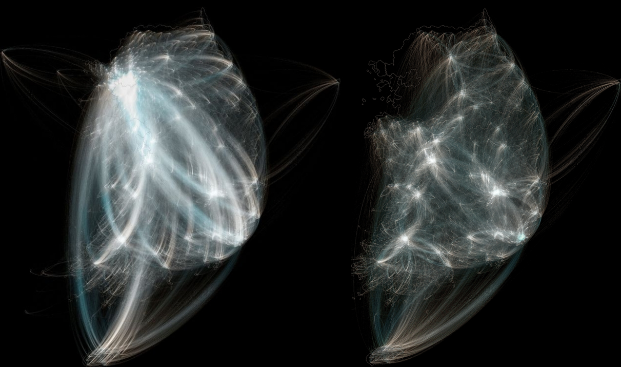 좌측 그림은 모두 그린 것인데 수도권을 기종점으로 한 이동이 지배적임을 볼 수 있다. 우측 그림은 그래서 수도권 기종점만 모두 걷어버렸다. 지방 대도시를 중심으로 오가는 이동들이 보인다. 마치 꽃잎처럼 오고가는 인구가 대도시 주변으로 펼쳐져 있다.