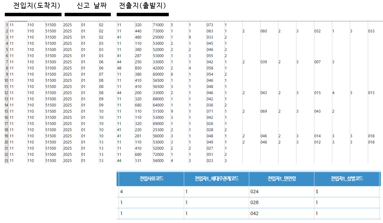 데이터를 받아보면 암호 같다. 첫 줄을 해석해보면 "2025년 1월 2일에 서울특별시 도봉구 방학제3동에서 종로구 청운동으로 73세의 세대주 남성이 주거환경의 이유로 전입하였다"는 의미다.