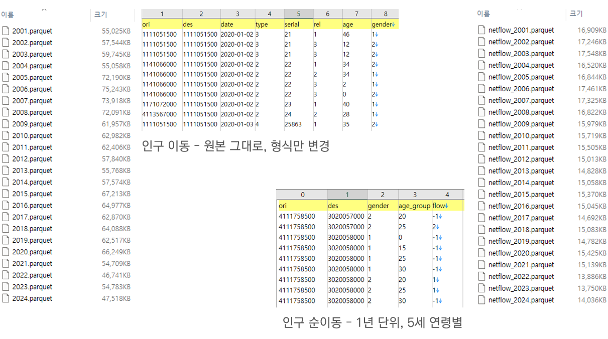 flow 폴더에는 원본을 빠짐 없이 형식만 변경하여 넣었고, netflow 폴더에는 한해 동안의 읍면동간 순이동을 성별과 5세 연령별로 집계해서 넣었다. csv 원본 같은 경우 500메가 가량 되는데 자체 압축 방식을 사용하면서 컬럼 방향으로 빠르게 연산할 수 있는 parquet은 거의 10%의 크기로 줄어든다.