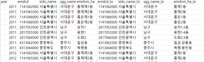 2. 시군구 이름에 일부 시 누락, 혹은 시점 불일치 --> [연도+시도+시군구+읍면동] 기준으로 key 만들어서 변환