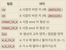그리고, shape_id 는 인접쌍 IoU ≥ 0.99 인 형상들을 union-find 로 묶어 부여한다. 0.99 이상을 같다고 보는 이유는 통계청 shp 의 미세한 토폴로지 차이를 흡수하기 위함이다. 1.0 으로 엄격하게 잡으면, 실제로는 변화가 없음에도 불구하고 지도 디지타이징의 미세한 특징들까지 잡아내므로 거의 모든 시점의 거의 모든 emd 가 다른 shape_id 가 되어 시계열 추적이 무의미해진다.