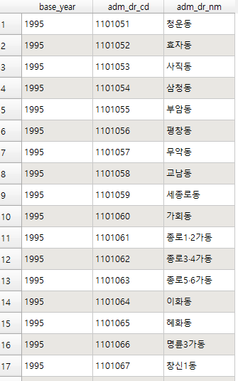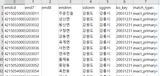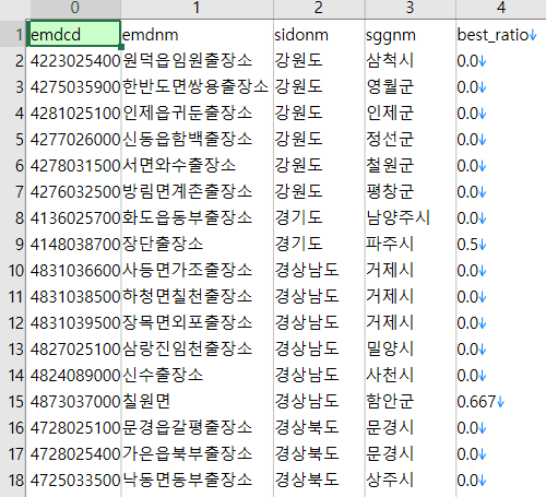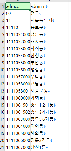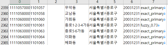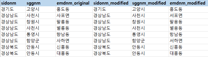 아래처럼 문자열이 조금만 비슷할 경우 적당히 매칭시키는 경우도 있다. 10자리 코드의 행정동 이름이 '종로1.2.3.4가동'으로, 가운데 점 대신 마침표가 찍힌 경우였다.