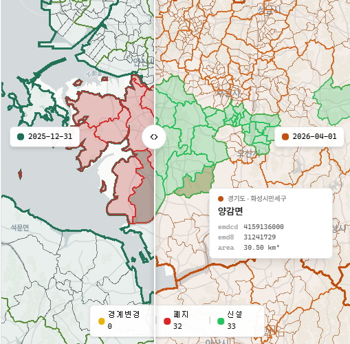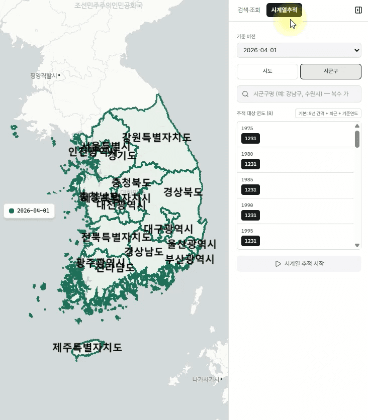 1975년부터 현재까지 62개 시점의 대한민국 행정동(읍면동·시군구·시도) 경계를 조회·검색·비교하는 인터랙티브 지도. 변경이력과 통계청 코드 매칭까지 한눈에.