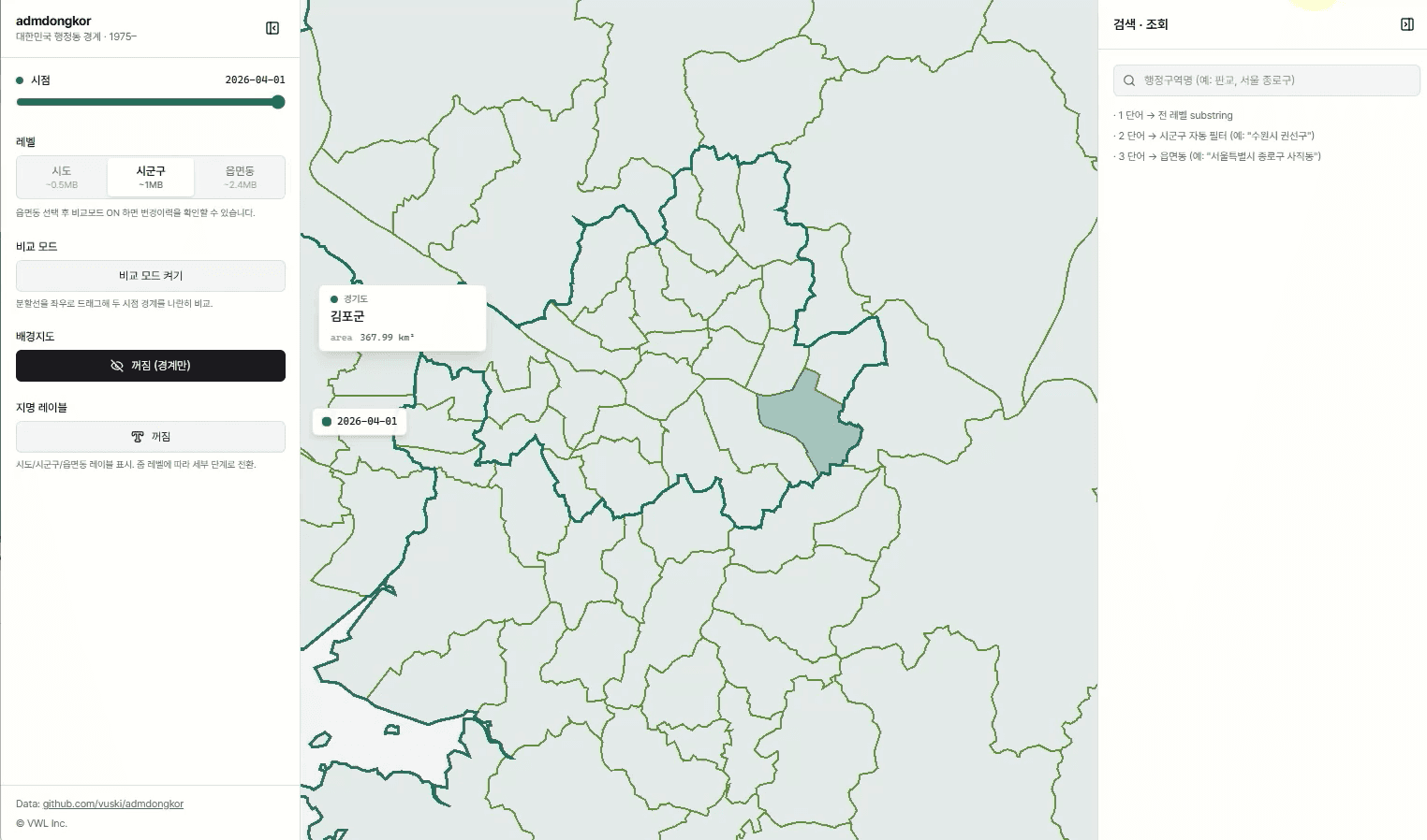 그 동안 admdongkor 데이터를 관리하면서 가장 번거로웠던 케이스인 부천, 그리고 그 밖에도 창원 등 여러가지 시군구의 변화 이력을 쉽게 볼 수 있도록 했다.