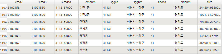 emd 도형의 속성은 아래와 같다. 통계청 7자리와 8자리가 공존하는 2020년의 경우 아래와 같이 emd7, emd8, emdcd, emdnm, sggcd, sggnm, sidocd, sidonm, 그리고 area 속성이 있다.