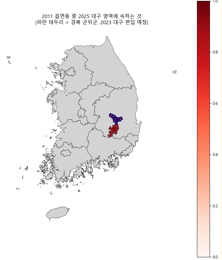 ax.set_title('2011 읍면동 중 2025 대구 영역에 속하는 것\n(파란 테두리 = 경북 군위군, 2023 대구 편입 예정)')