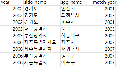 4. 시군구 단위로 이름이 잘못된 경우 --> 연도+시도+시군구 매칭 후 변환