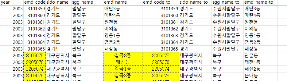 emd와 sgg, sido 파일 중 일부는 각각 아래와 같다. 1975~2015년의 경우 해당 연도 말일(12월 31일)이라는 보장은 없었지만, 조회의 편의를 위해 그렇게 정했으며, 위의 매칭 작업에서도 되도록 연말 기준으로 맞췄다.