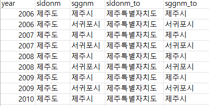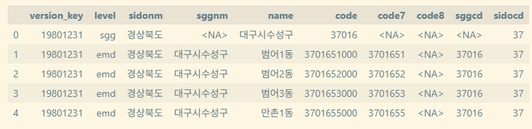 시군구 이름(sggnm)같은 경우에는 일부러 띄어쓰기를 하지 않았다. 읍면동, 시군구, 시도 문자열을 결합하거나 다시 분리할 때 '성남시 수정구'로 관리하는 것보다 '성남시수정구'가 편리하다. 읽는데도 그다지 혼동이 없다.