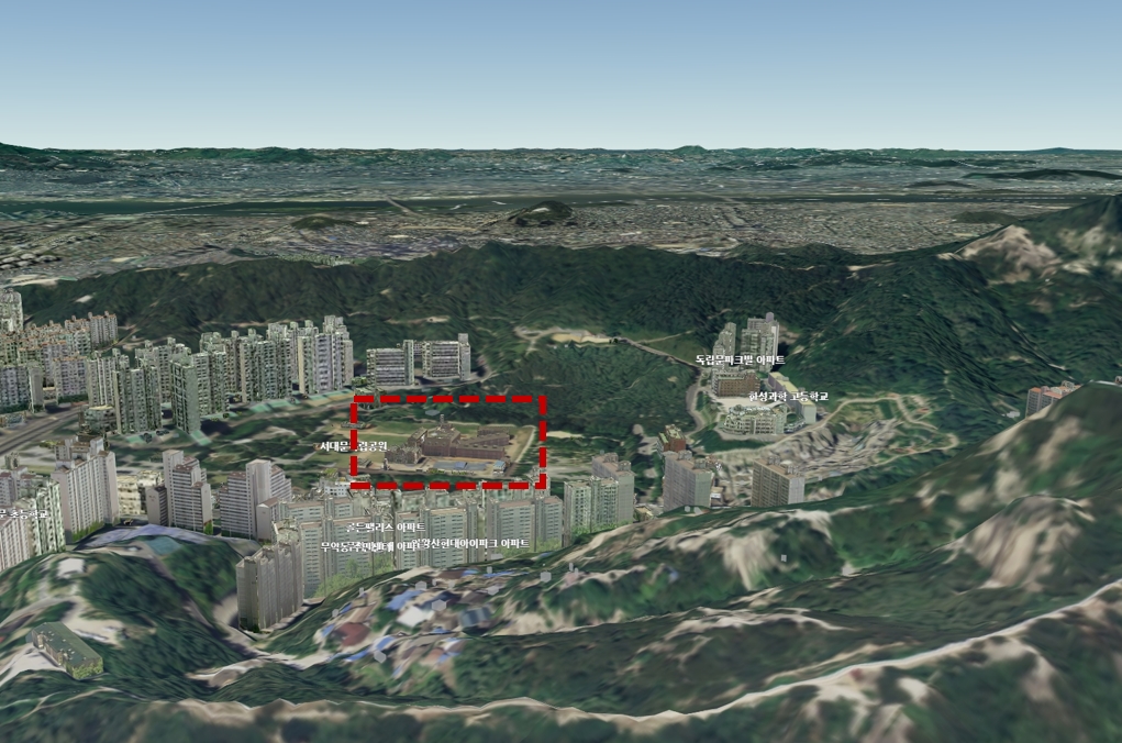 하는김에 어디서 찍었는지도 찾아보기로 한다. 서대문형무소 건물의 찍힌 각도와 근경의 언덕들을 조합해보면 어렵지 않게 찾을 수 있다.