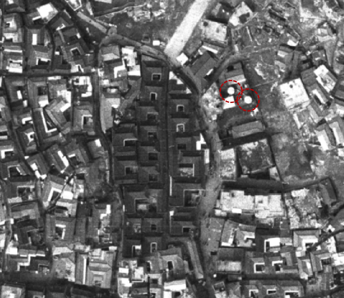 찾았다. 각각 1,2,3번의 지붕형태, 그리고 뒤쪽의 집들이 모두 일치한다. 한옥지붕보다 근거리에 있는 건물들은 항공사진에서 찾아보기 어렵다. 항공사진의 시기와 Nick Dewolf 사진의 시기가 약간 다른 것 같다.
