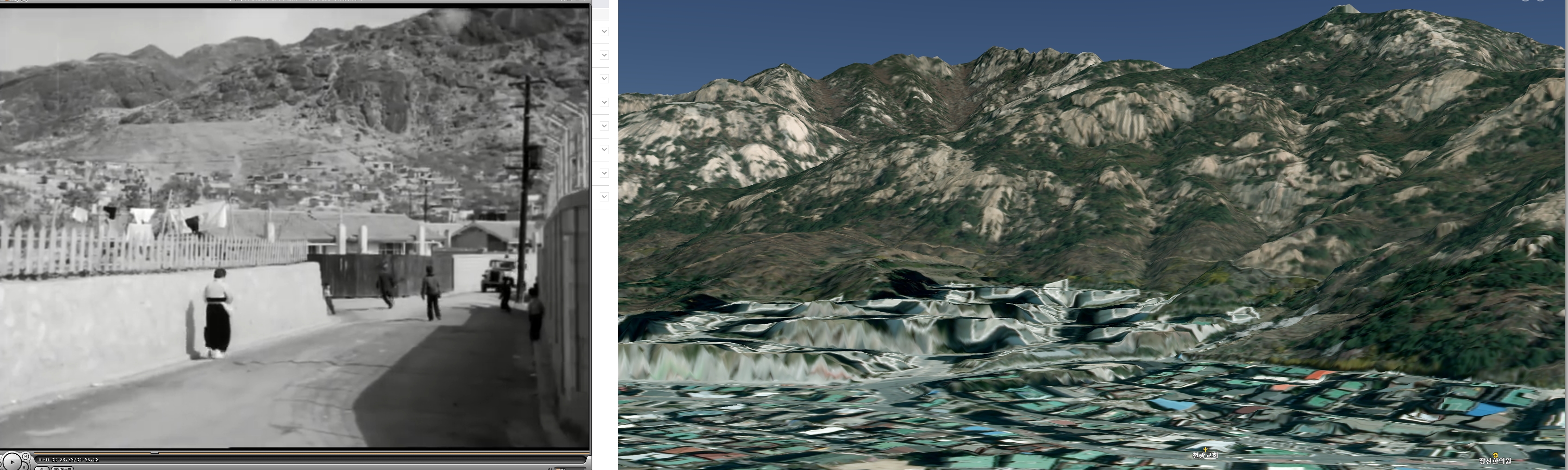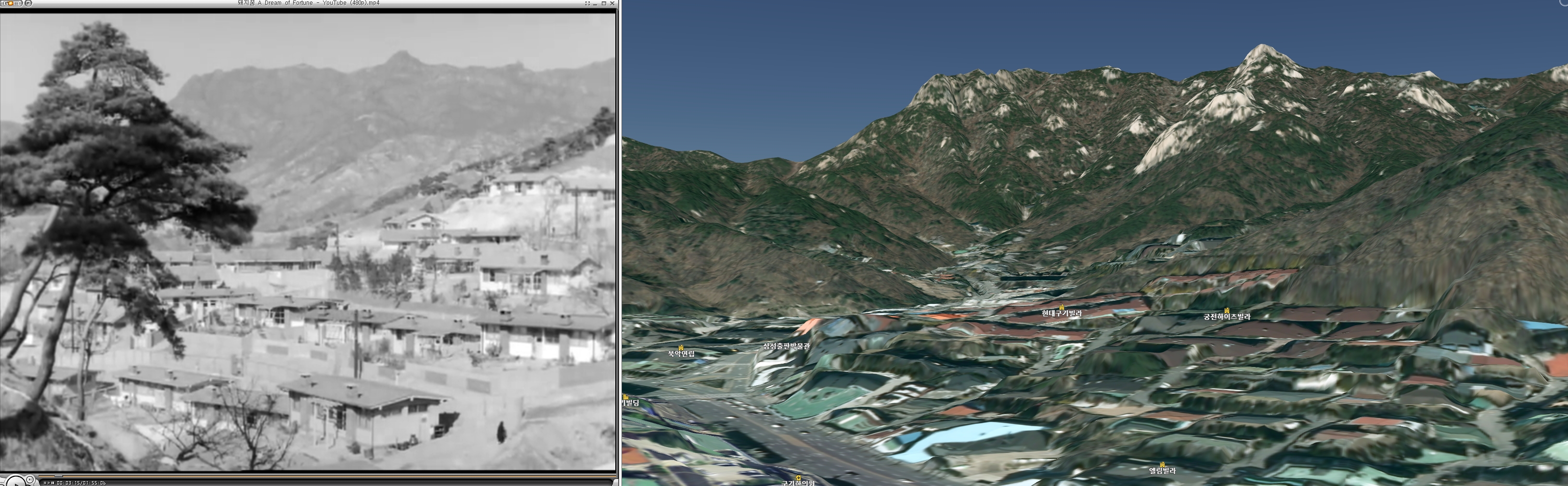 서울의 특징은 산인데, 비슷한 산세가 드물다. 옛날 영화든, 사진이든 산세가 뚜렷하게 나와 있다면 대부분 찾을 수 있다. 인공지능처럼 우아한 기술을 쓴다면 좋겠지만 일단 '마우스 이리저리 스크롤'이라는 고전적 기술을 사용해보기로 한다.
