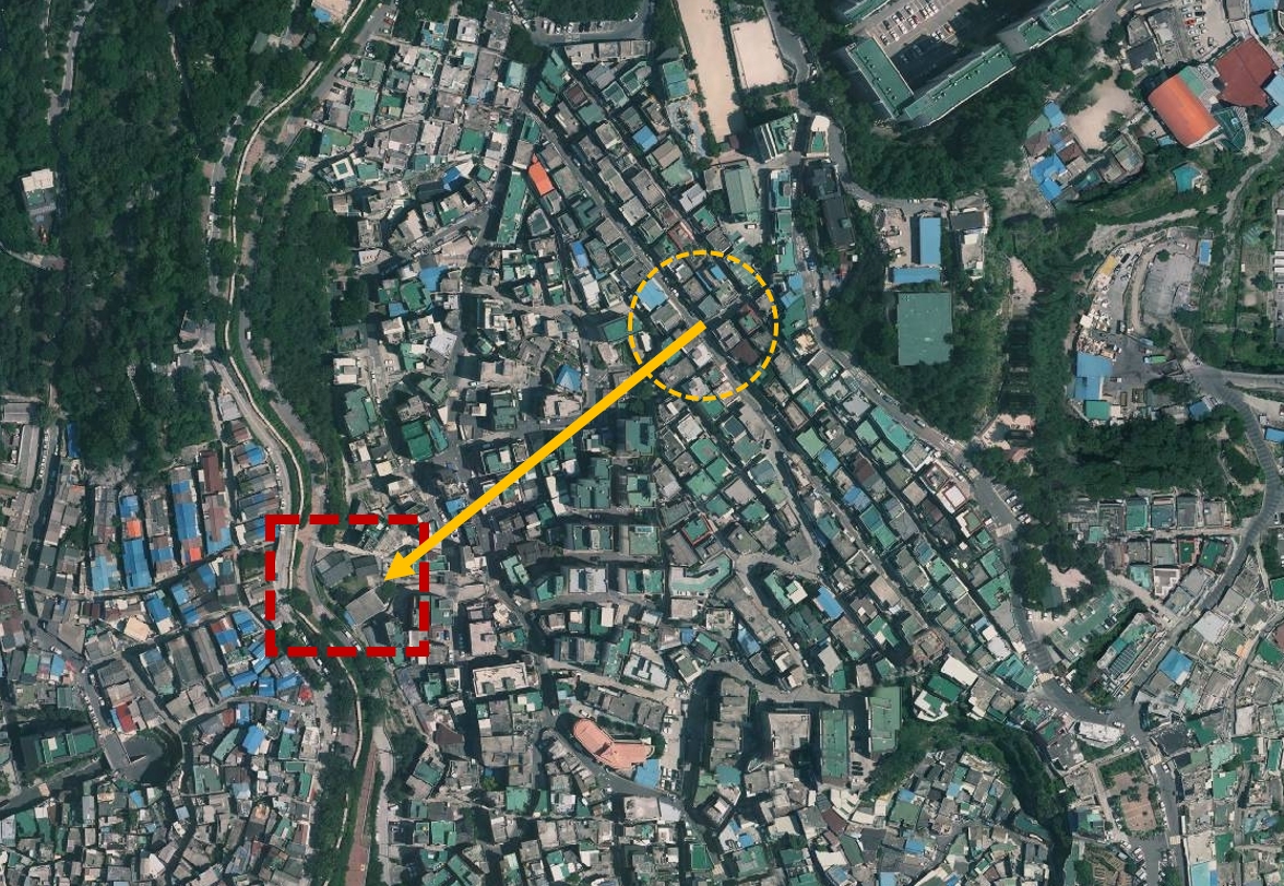 그림자 방향을 볼 때 서쪽에서 동쪽 정도를 본게 아닐까 생각했다. 다만, 사진에서 보이는 한옥이 어느정도 규모가 있으므로 지붕의 형태로 찾기 시작했다. 완곡하게 꺾이는 길이 있고, 그로부터 시작되는 경사지형이라는 점도 참고했다.
