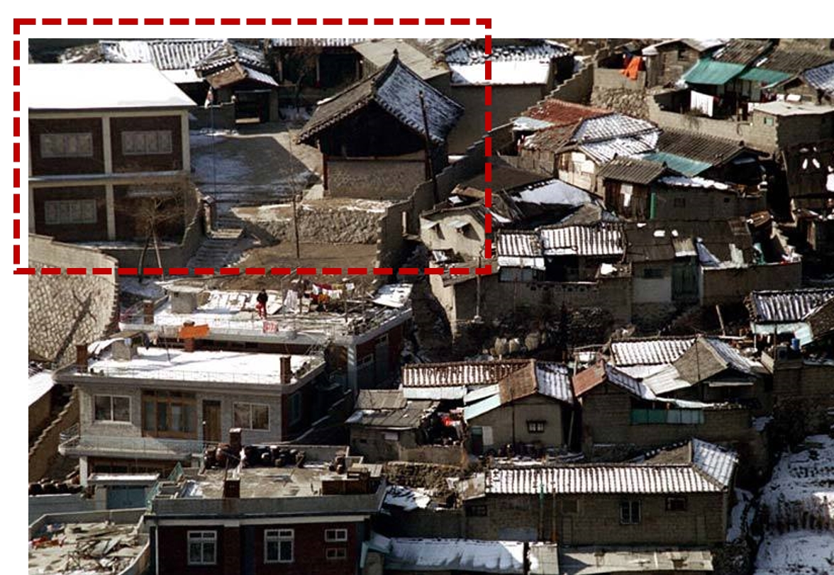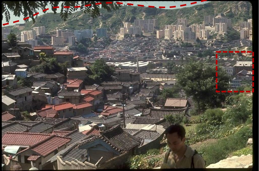 건물의 각도를 볼 때 아마 장수마을쪽 언덕에서 찍었을 것이라고 생각한다.