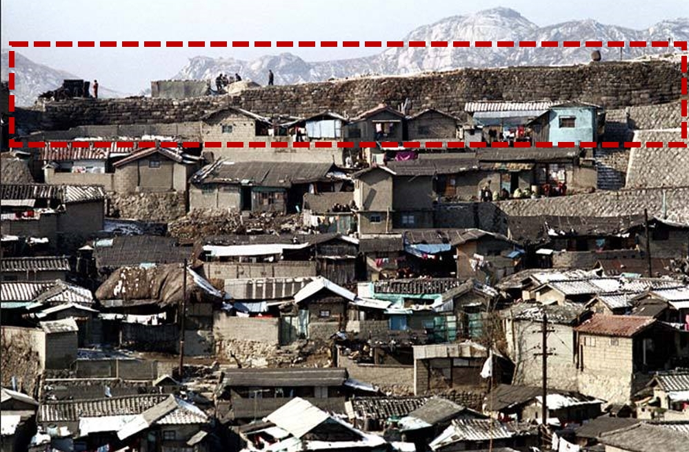 인왕산을 동쪽에서 봤다면 한양도성과 겹치는 부분은 두 곳. 바로 아래쪽 기슭일리 없으니 위의 사진에서 동측 낙산 너머 창신동쪽이겠다.