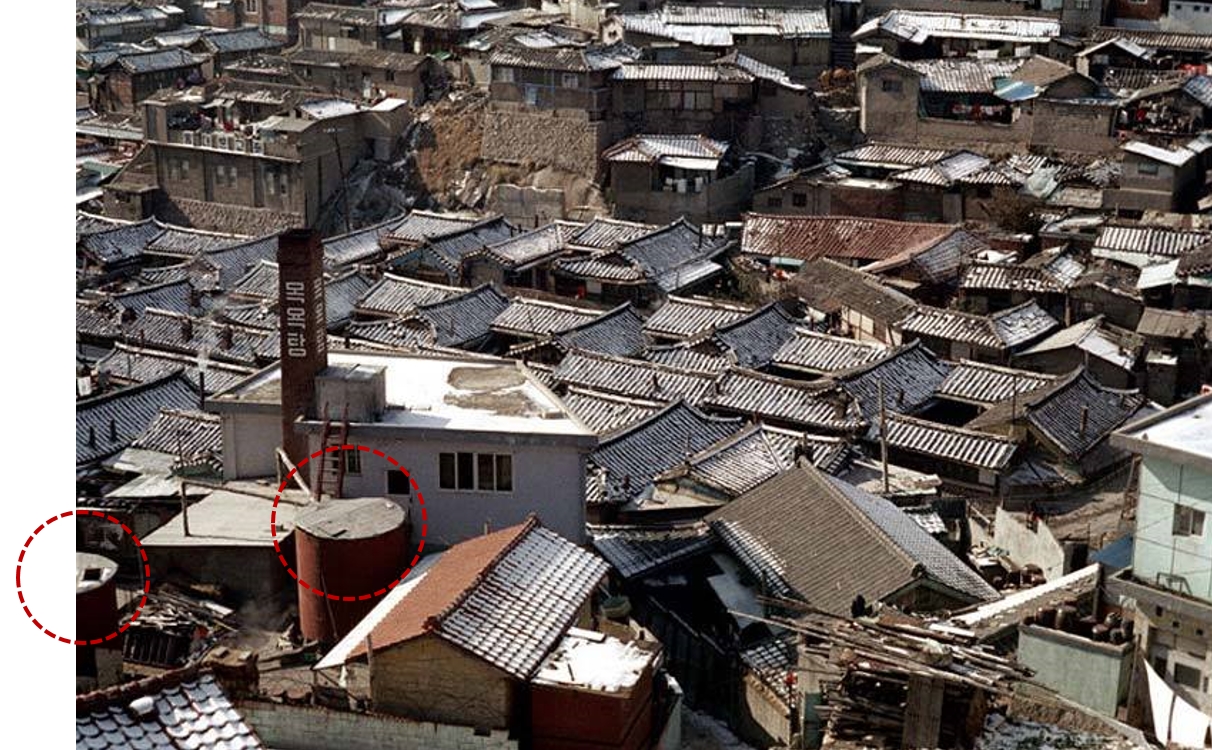 목욕탕 뒤의 보일러인지 물탱크인지 원기둥 형상의 무엇인가가 정확히 일치한다.