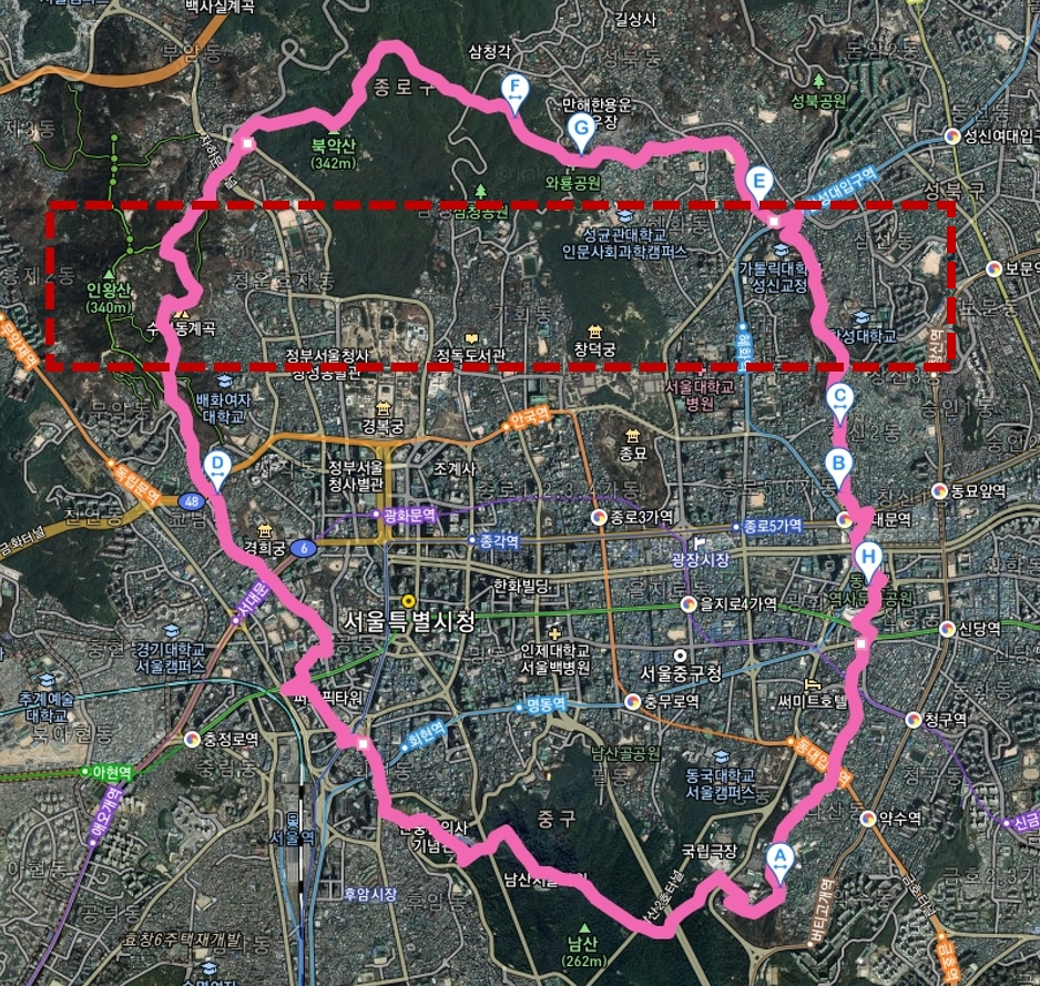 카카오맵에서 '한양도성'을 입력하면 위처럼 친절하게 분홍색 테두리를 그려준다.