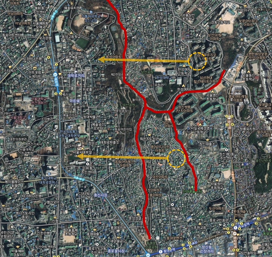 지형을 좀 살펴본 결과 창신동에서 북쪽 능선 너머 삼선동쪽일 것이라고 생각했다.