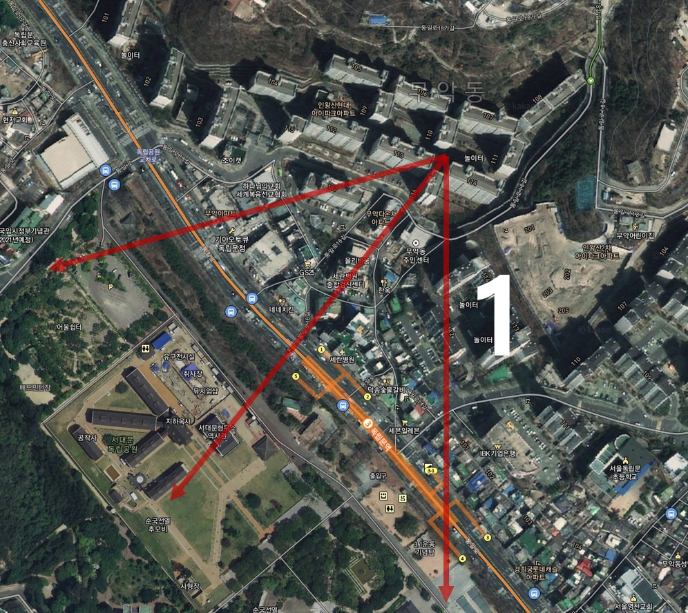 하는김에 어디서 찍었는지도 찾아보기로 한다. 서대문형무소 건물의 찍힌 각도와 근경의 언덕들을 조합해보면 어렵지 않게 찾을 수 있다.