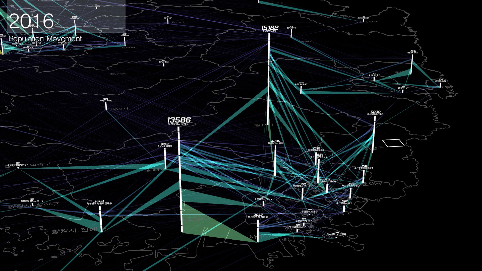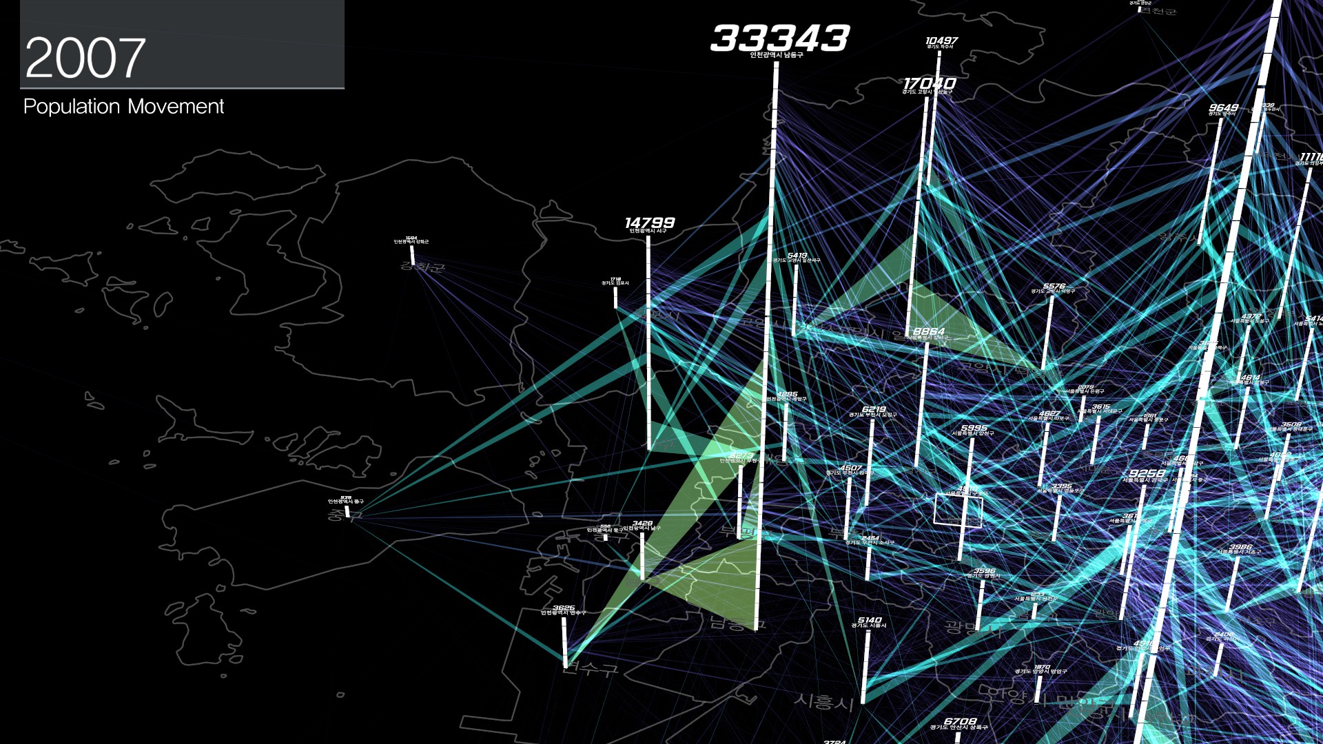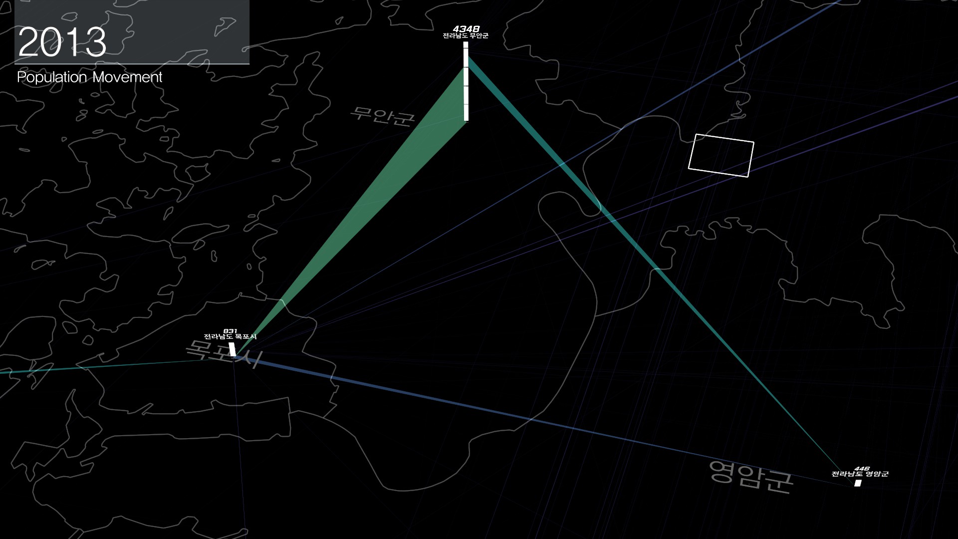 일단 전라남도 무안군에 솟아오른 하얀 막대는, 무안군이 전국 각 시군구와의 관계에서 2013년 한 해 동안 인구가 순유입 된 경우를 모두 더한 것이다. 한 가지 헷갈리면 안 되는 점은 무안군의 2013년의 총 순유입량은 아니라는 점이다. 무안군이 어느 시군구로 순유출 된 경우가 있다면, 그 수치는 이 막대 그래프에서 계산되지 않았다. 따라서 위의 그림만으로는 2013년 한 해 동안에 무안군의 인구가 늘었는지 줄었는지는 판단하기 어렵다. (이것이 앞서 말한 단점이다)