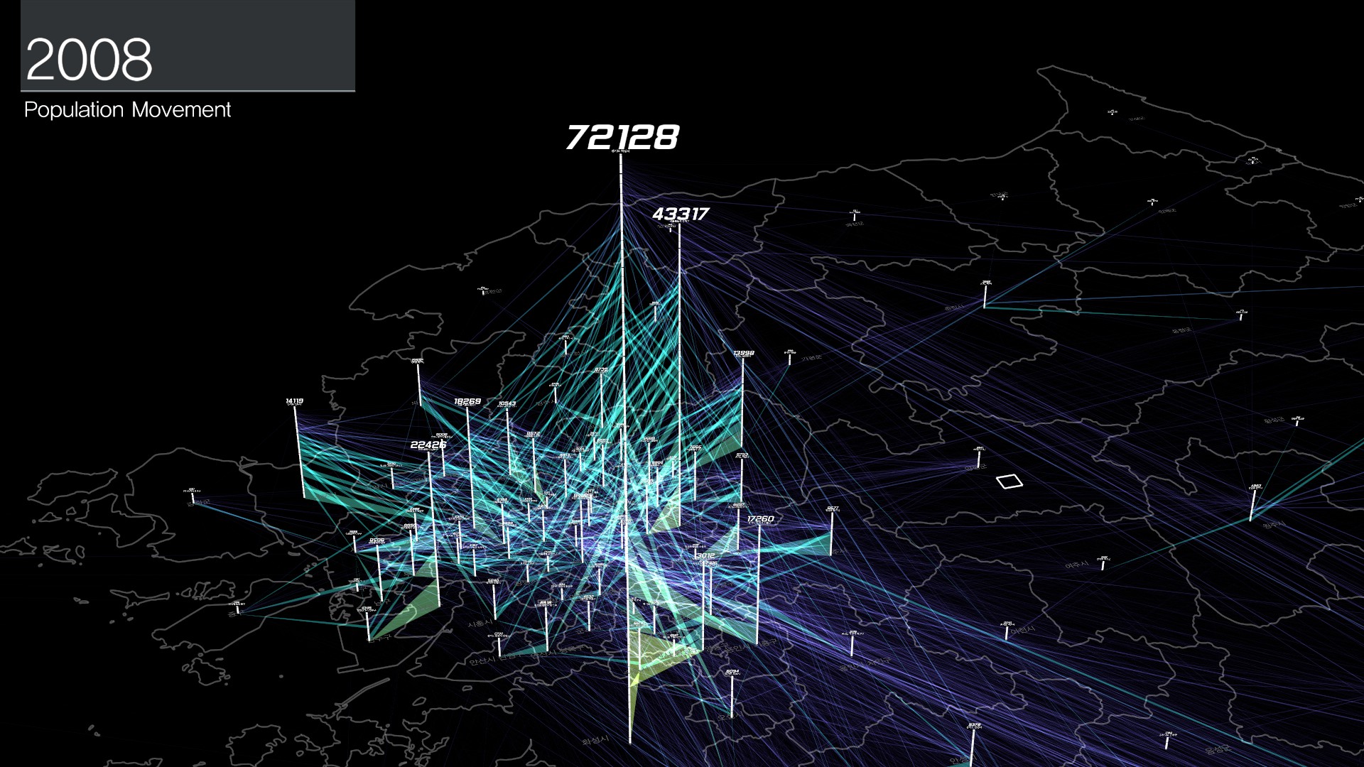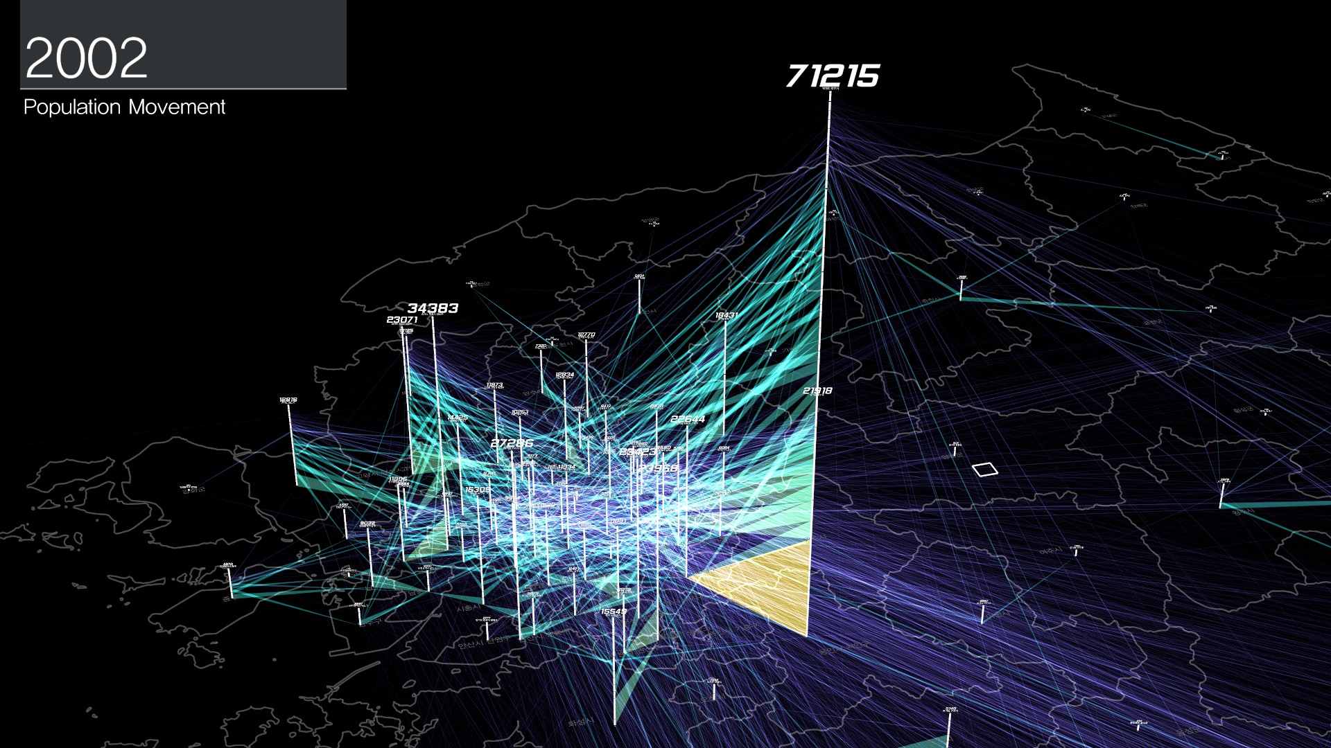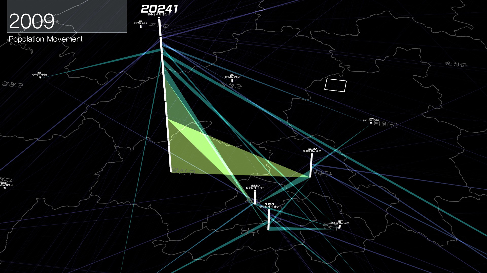 일단 전라남도 무안군에 솟아오른 하얀 막대는, 무안군이 전국 각 시군구와의 관계에서 2013년 한 해 동안 인구가 순유입 된 경우를 모두 더한 것이다. 한 가지 헷갈리면 안 되는 점은 무안군의 2013년의 총 순유입량은 아니라는 점이다. 무안군이 어느 시군구로 순유출 된 경우가 있다면, 그 수치는 이 막대 그래프에서 계산되지 않았다. 따라서 위의 그림만으로는 2013년 한 해 동안에 무안군의 인구가 늘었는지 줄었는지는 판단하기 어렵다. (이것이 앞서 말한 단점이다)
