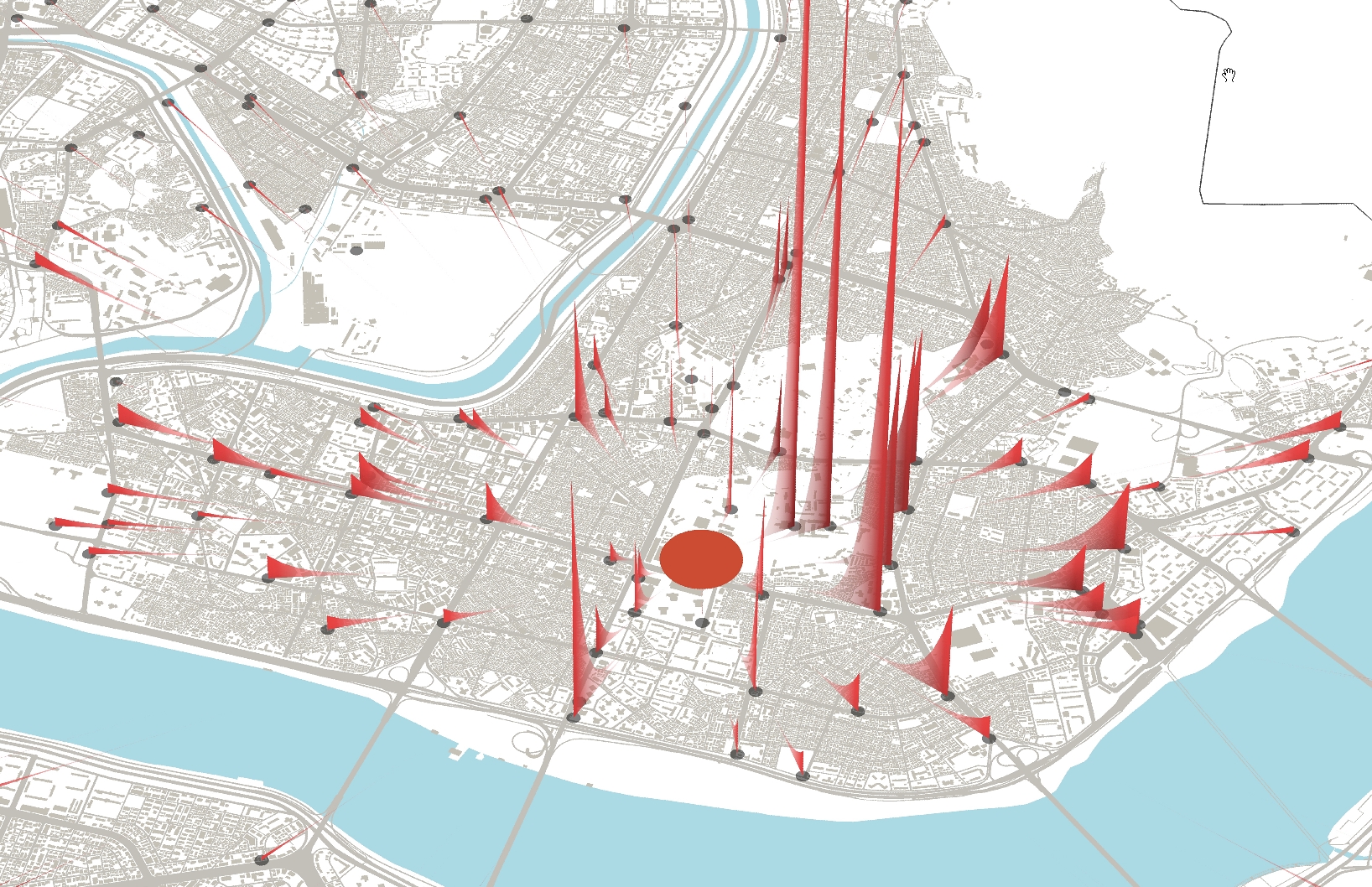 그럼 간단히 순위만 보자. 아래 그림에서 빨간 동그라미는 순위 대여소, 그리고 삼각형들은 순위 대여소에서 대여한 자전거를 반납한 장소, 혹은 반납한 자전거를 대여한 장소들의 대여반납량을 표시한 것이다.