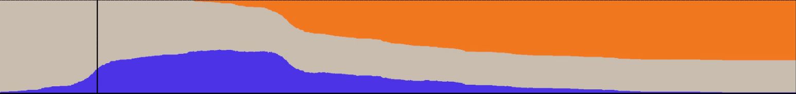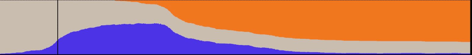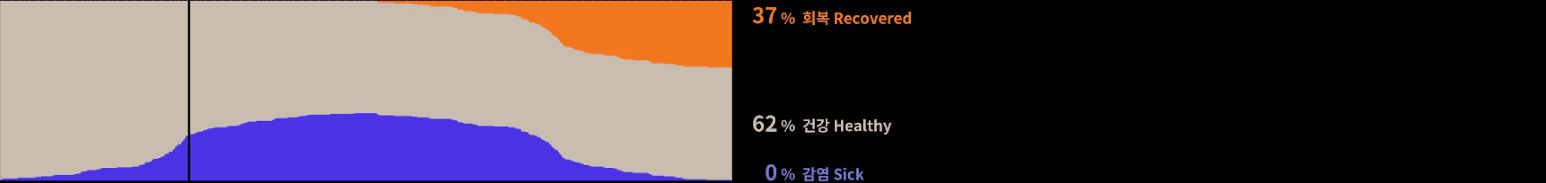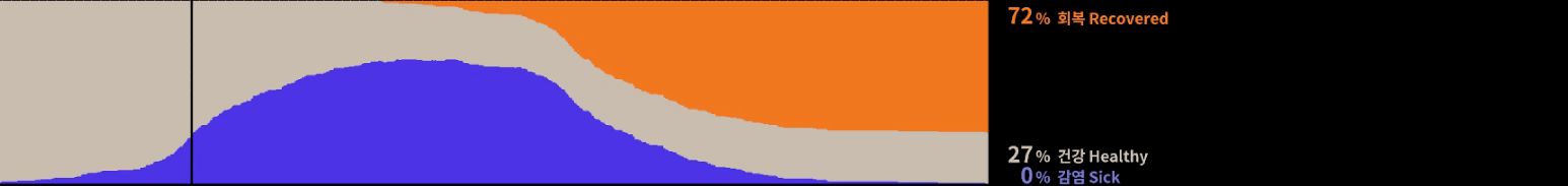 시간이 지나면 모든 사람이 한 번쯤은 병에 걸린 상태가 된다. 그 지점을 상단 그래프에 흰색 수직선으로 표현했다.