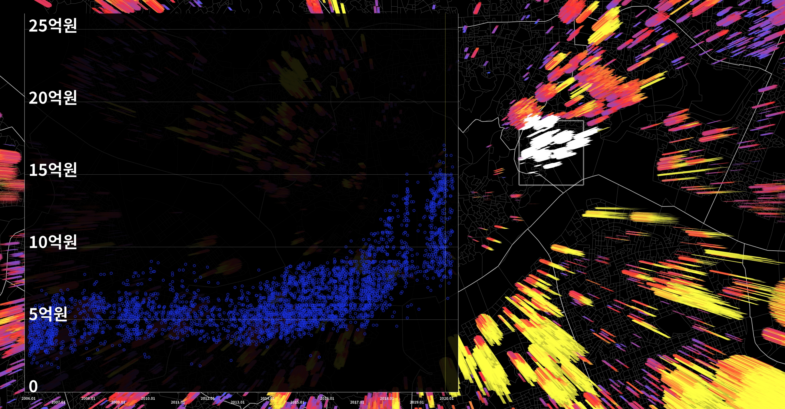 2019.12.16 규제 이후(그래프에서 희미한 노란 수직선)에는 오히려 15억 이하가 없다. 이미 15억은 넘어섰다고 판단되었는지 규제는 하한선으로 작용하고 있다.