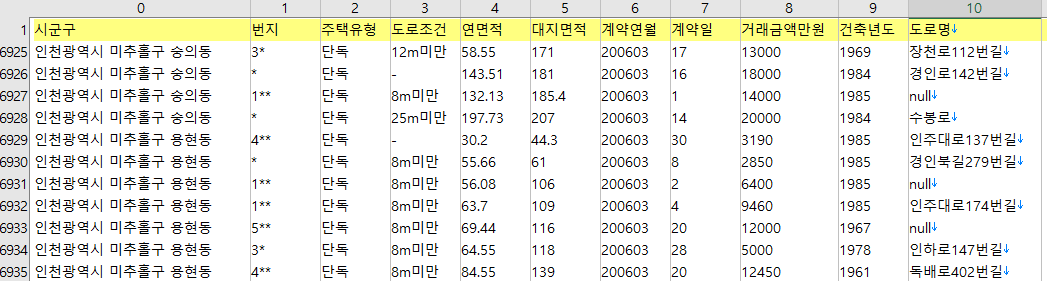 법정동 단위까지만 제공되는 경우는 번지를 별표처리했다. 그런데 위의 예를 보면 5** 번지는 500번대 번지, 1***대 번지는 1000번대 번지라는 것을 추측할 수 있다. 사실 10-1을 1***으로 처리한 것일수도 있지만, 최대 자리수가 네자리인 것으로 보아 본번과 부번 중 본번만 별표처리하여 표기한 것 같다. 굳이 부번까지 특정하고자 하면 여러가지 데이터를 조합하여 찾아낼 수 있을 것 같기도 하지만, 일단 여기서는 공개한 수준까지만 처리하기로 한다.