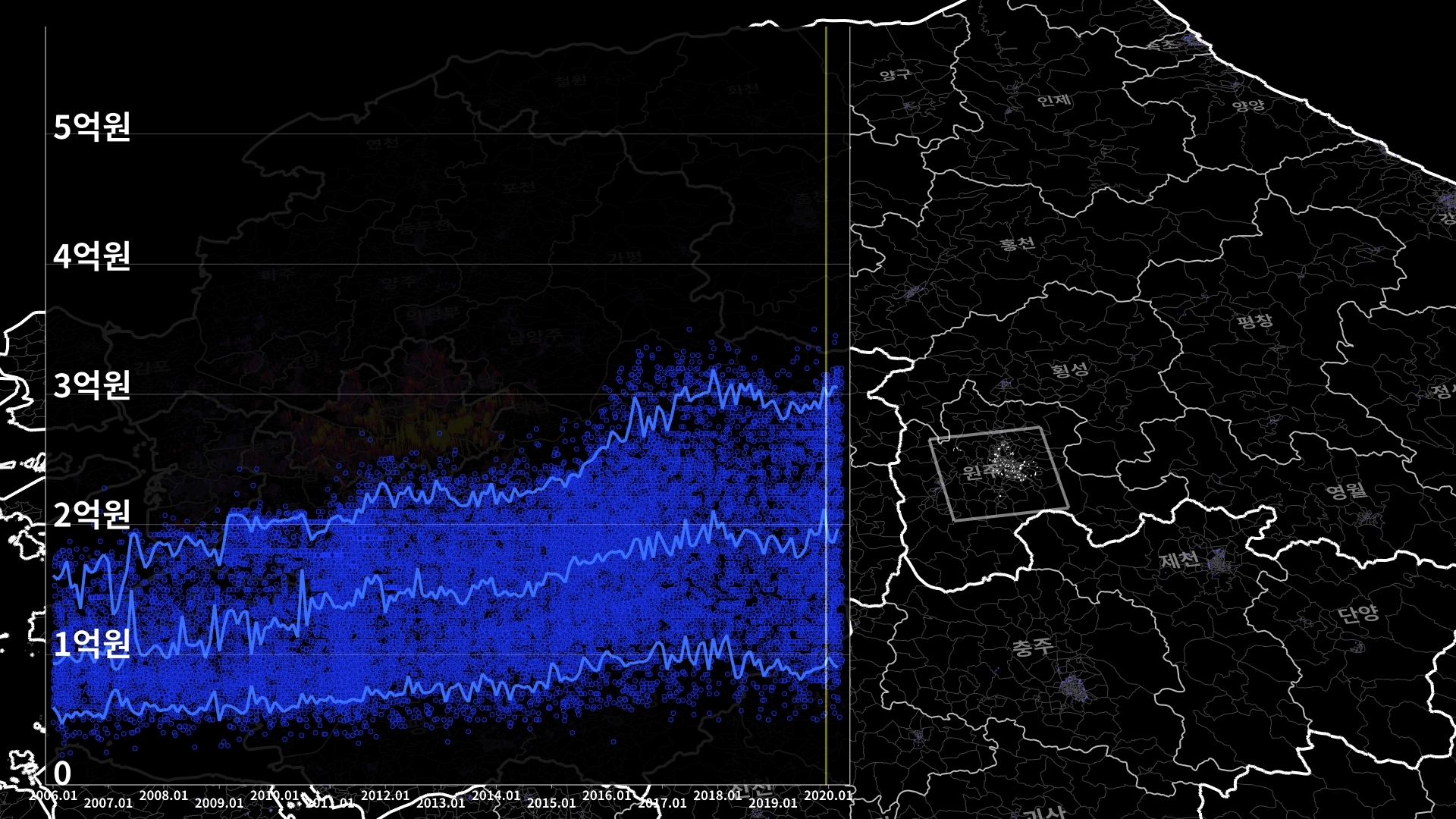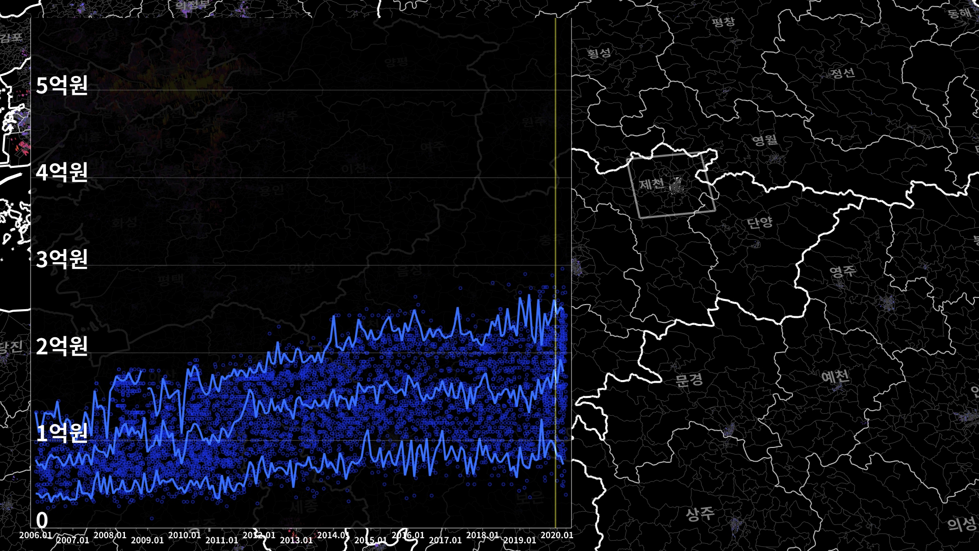 지도부터 설명하자면, 지도에 솟아오른 막대 하나하나는 실거래가 1건을 가리킨다. 막대의 높이는 실거래가에 비례하도록 두었고, 색상 역시 그러하다. 저 그림에서는 푸른색 -> 붉은색 -> 노란색일수록 실거래가 높다. 경우에 따라 다른 계열의 그라데이션이 사용될 때도 있다.