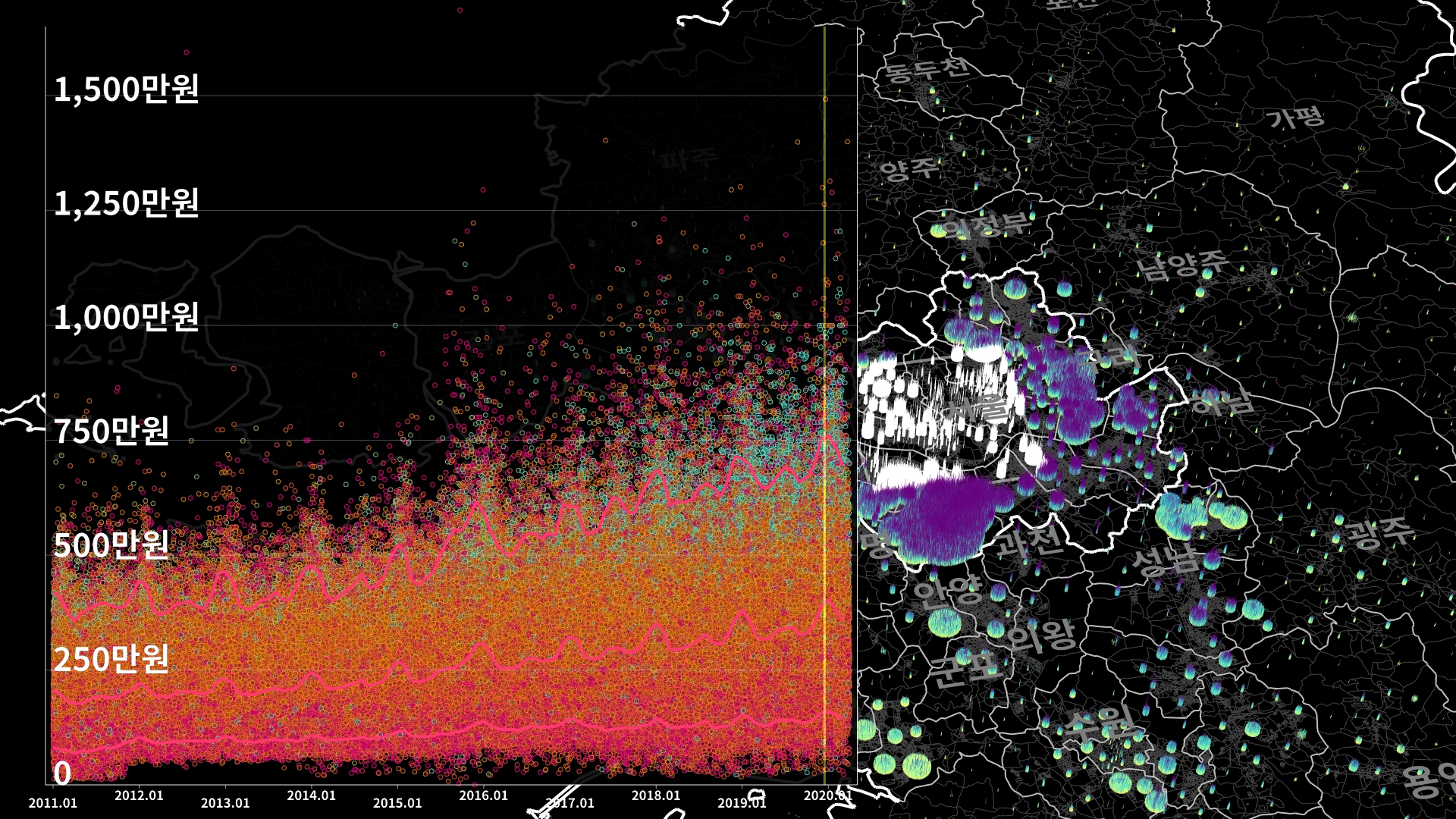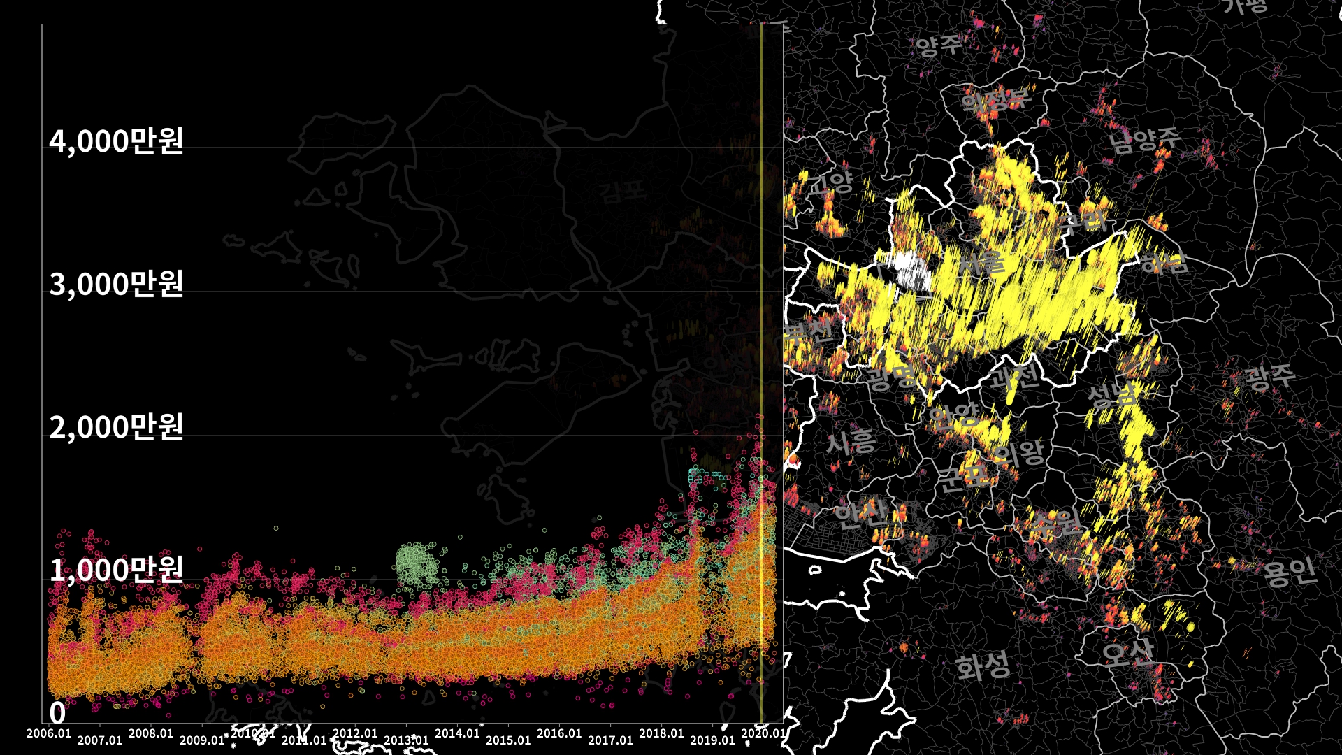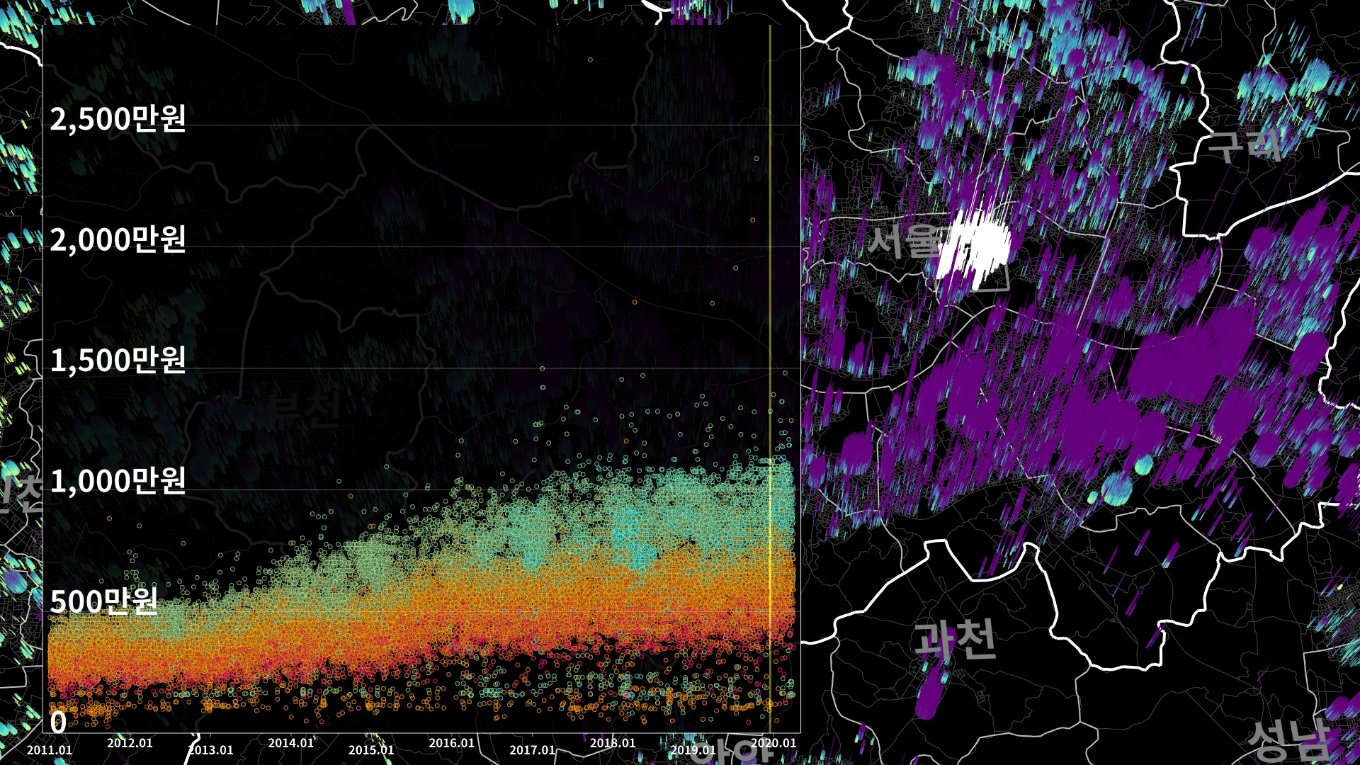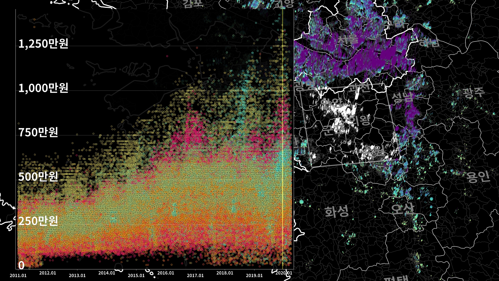 붉은색은 1980년경 혹은 그 이전에 완공된 아파트의 실거래건이고, 하늘색 계열로 올수록 2020년 최근에 신축한 아파트의 실거래건이다.