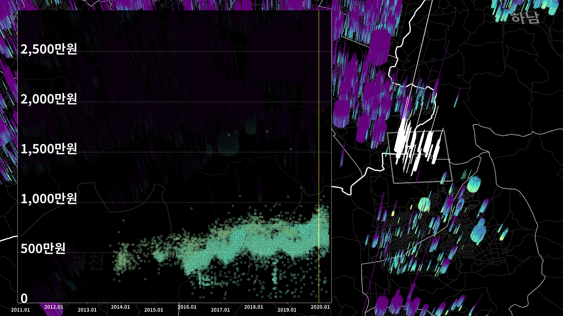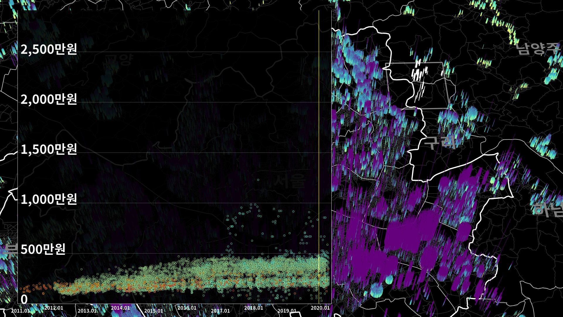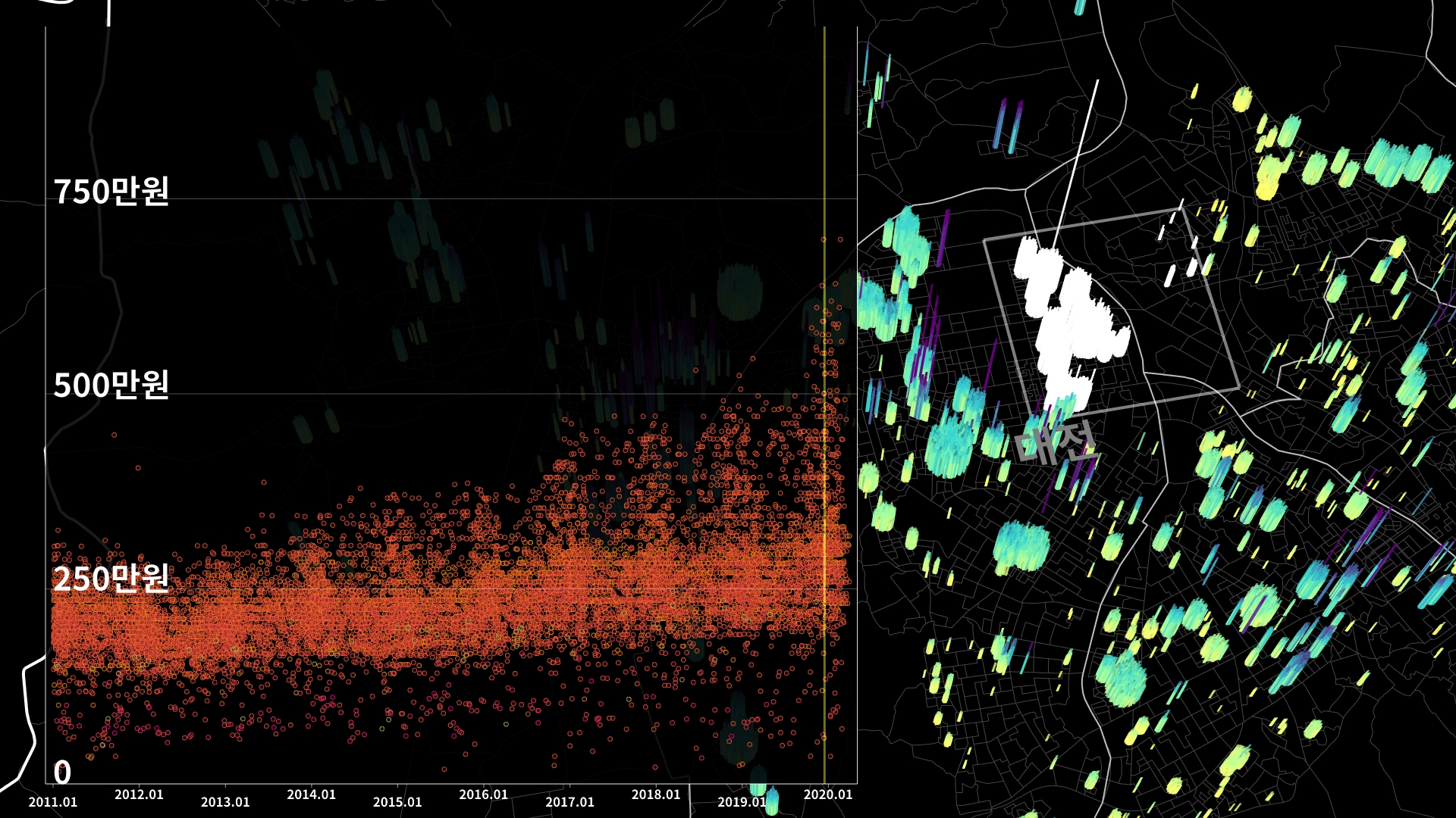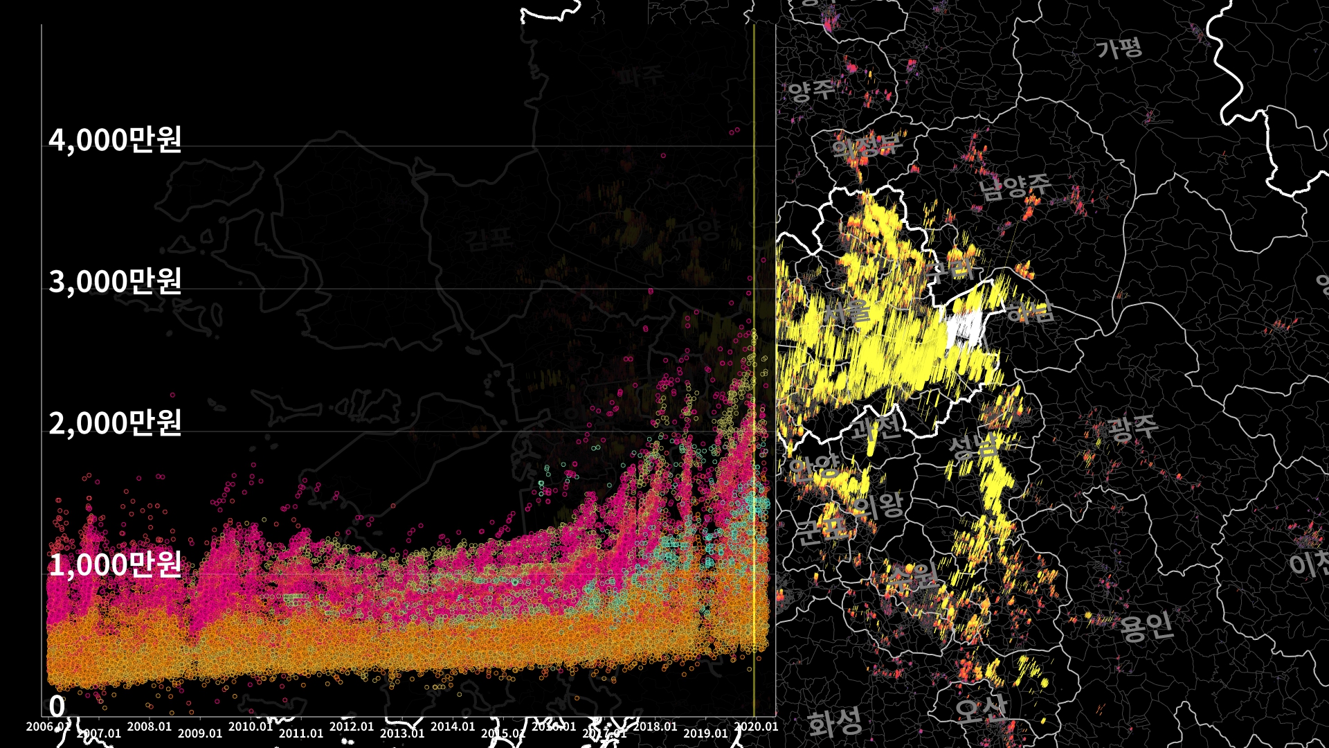 붉은색은 1980년경 혹은 그 이전에 완공된 아파트의 실거래건이고, 하늘색 계열로 올수록 2020년 최근에 신축한 아파트의 실거래건이다.