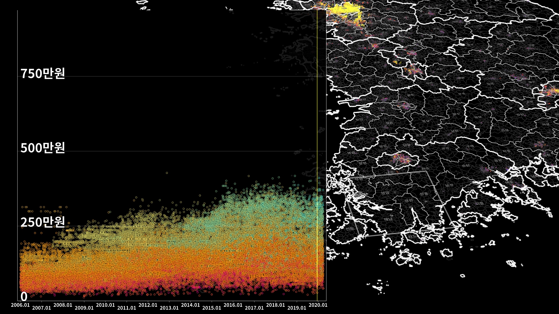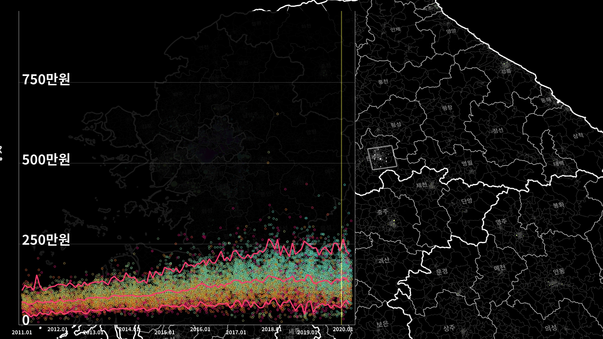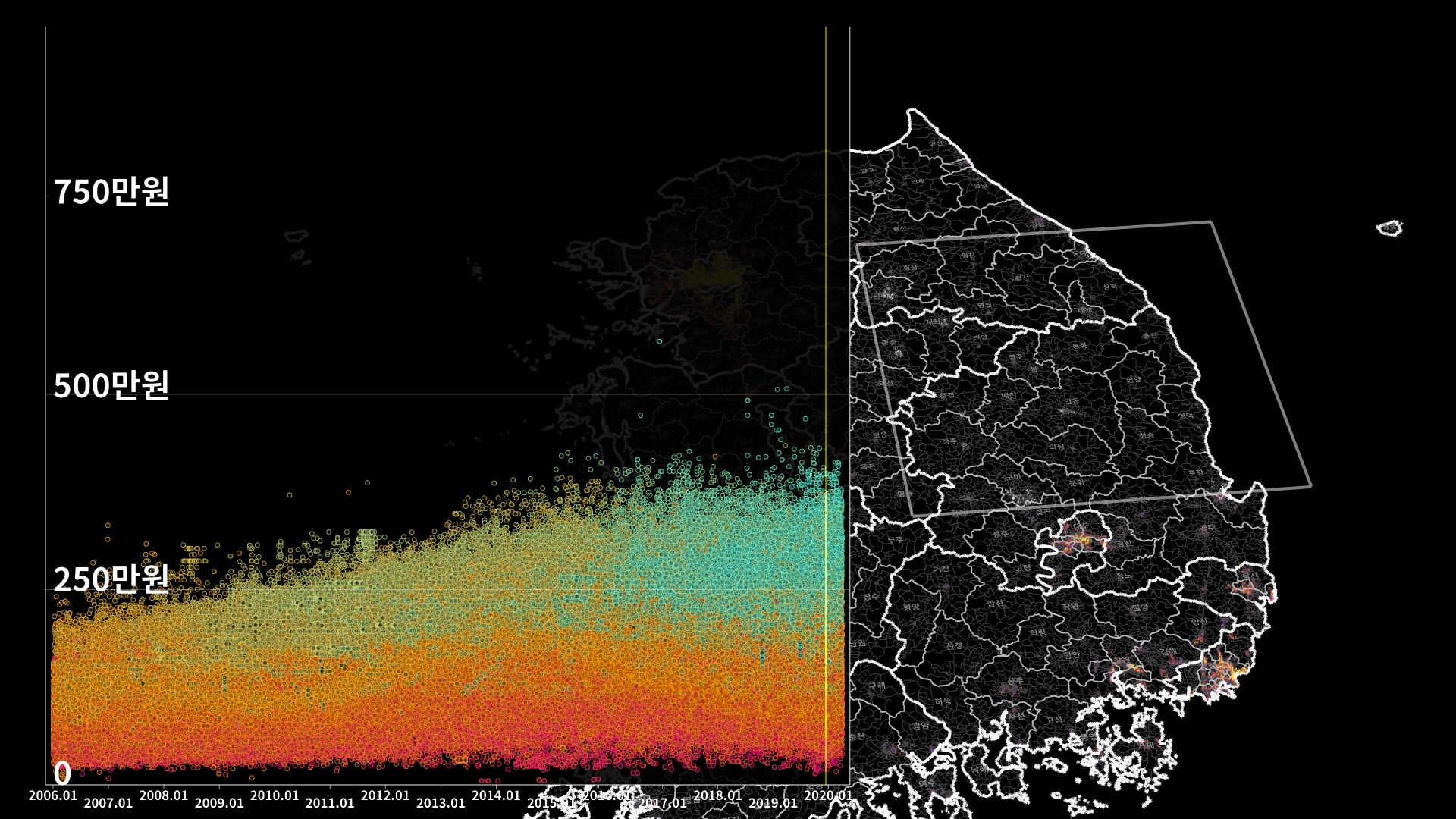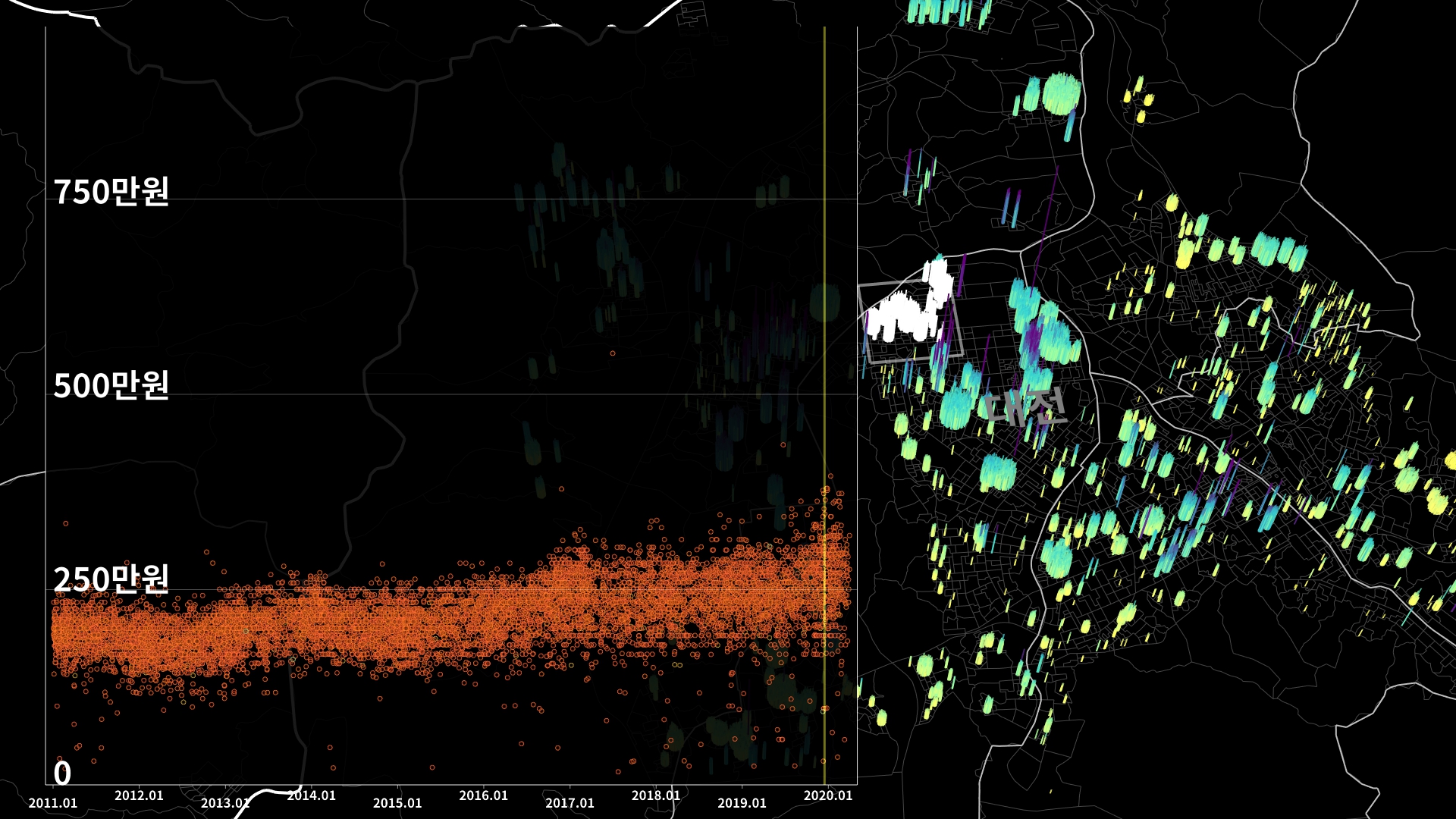 붉은색은 1980년경 혹은 그 이전에 완공된 아파트의 실거래건이고, 하늘색 계열로 올수록 2020년 최근에 신축한 아파트의 실거래건이다.