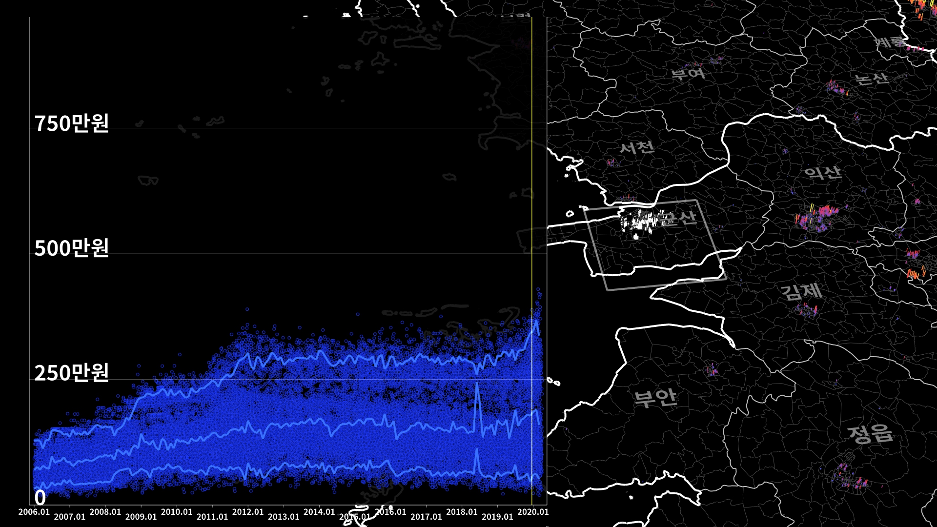 위의 그래프를 보면 최근 들어 군산의 아파트 가격 상위 10%가 급상승한 것처럼 보인다. 이게 틀린 말은 아니지만, 아파트 가격은 단지마다 상황이 다르고 배타적으로 가격이 형성되기 때문에, 그저 상위 10% 가격이라고 하면 개별적인 사실들이 녹아있는 데이터의 많은 부분을 놓치게 되어버린다.