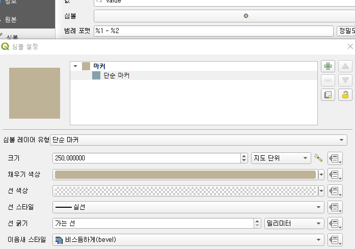 원의 크기를 좀 바꿔본다. 다시 심볼 설정 -> 단순마커에서 [크기] 맨 우측의 아이콘을 클릭하여 직접 편집한다.
