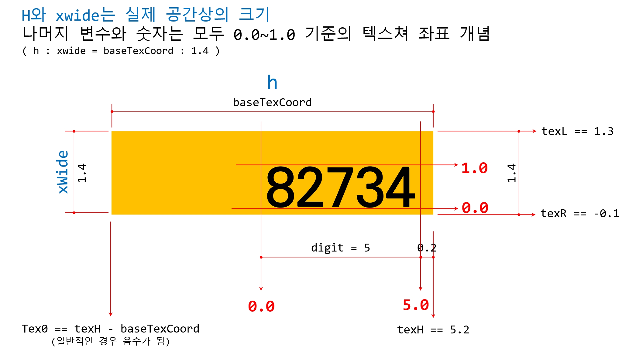 //비례식 h: xwide = baseTexCoord : 1.4 에서 변환된 식 float baseTexCoord = (1.4 * h ) / xwide;