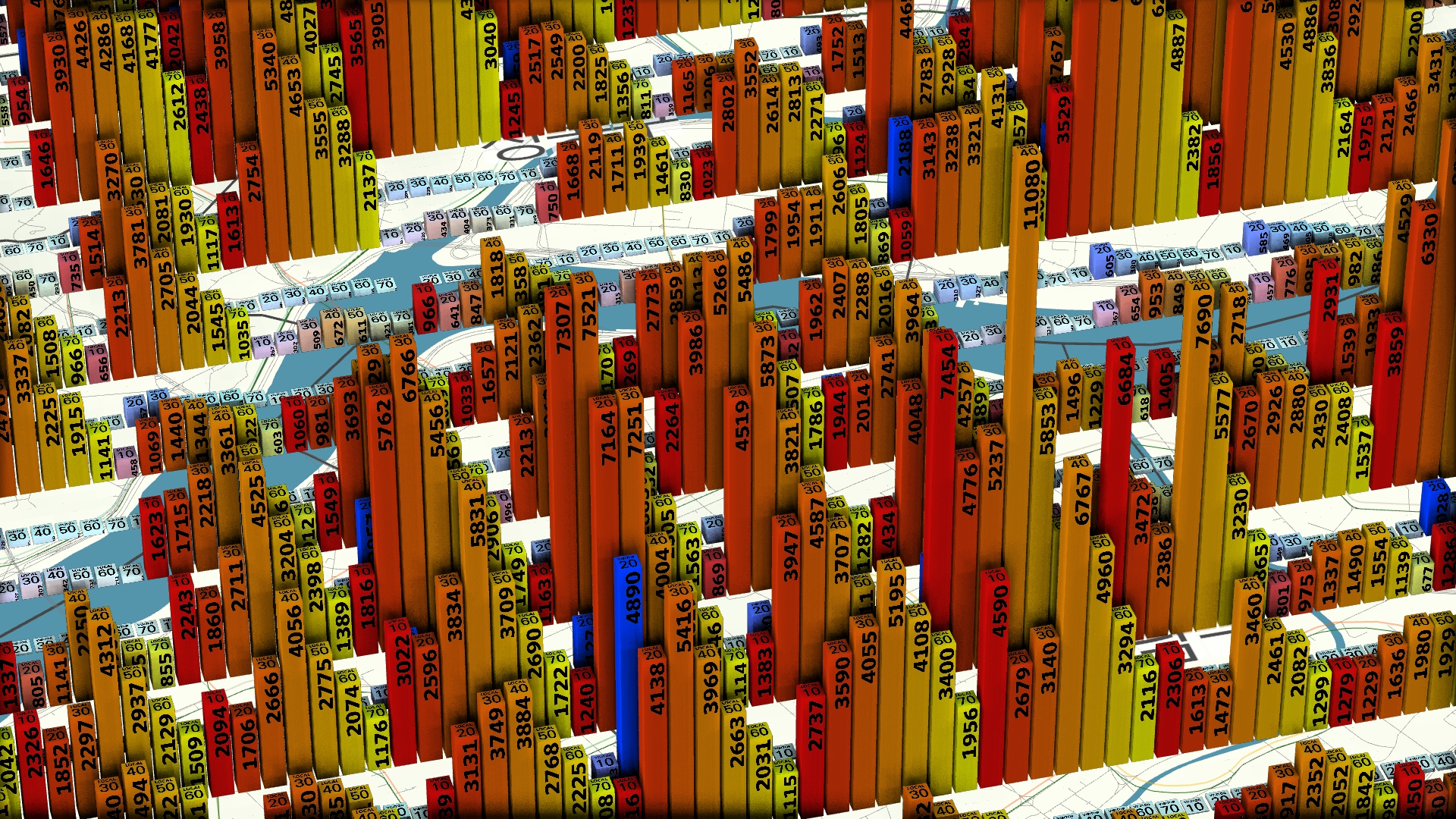 어떤 경우에는 몇 개의 숫자가 크고 명료하게 보여야 하지만, 때로는 '데이터스러운 느낌'을 주기 위해서 많은 양의 숫자가 필요할 때도 있다. 물론, 그 숫자들은 임의로 생성한 것이 아니라 데이터에서 비롯된 정확한 숫자가 되어야 한다. 인터랙션의 경우를 생각한다면 선택적으로 확대해서 볼 수도 있어야 하기 때문이다.