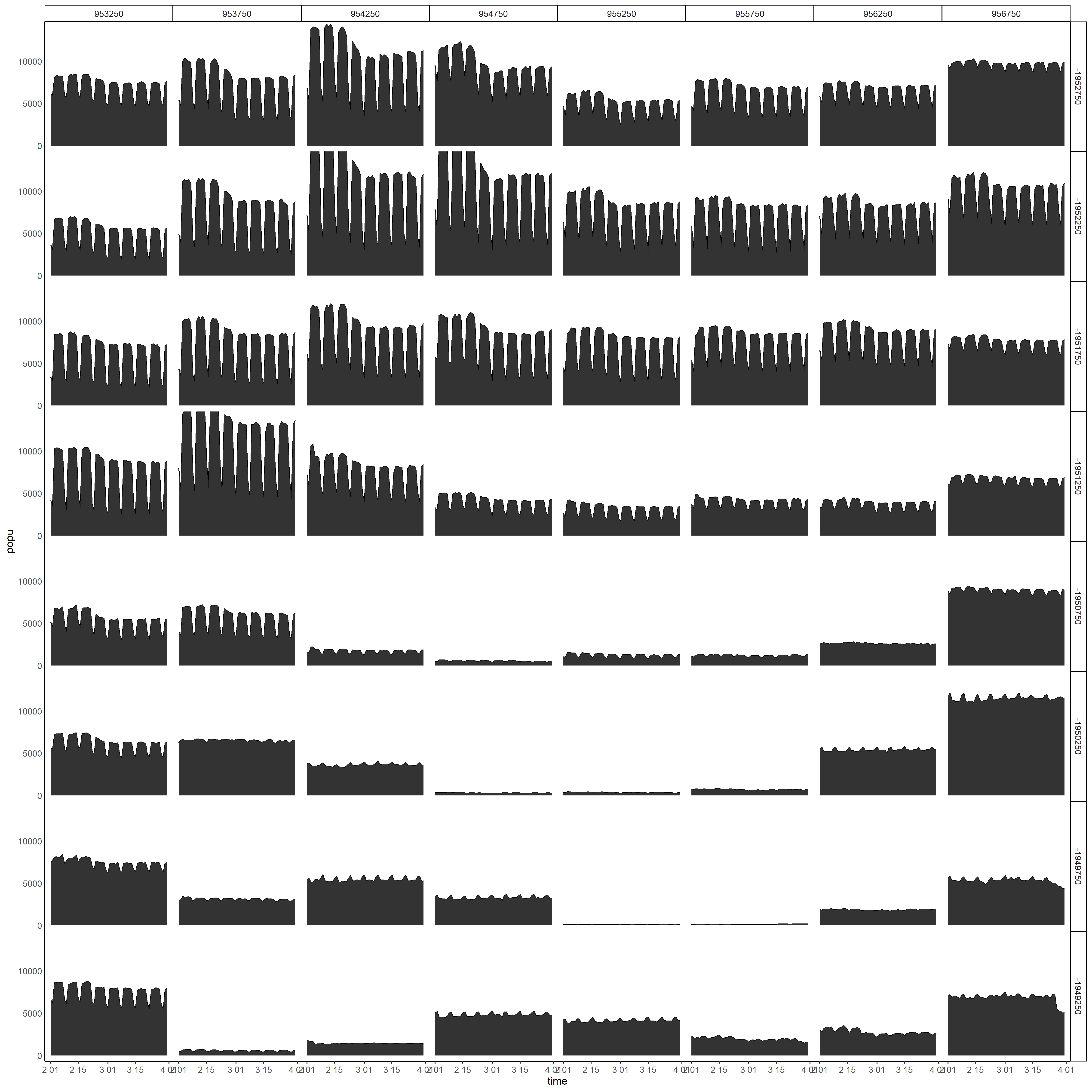 temp <- gridPopu %>% mutate(x = as.integer(as.integer(x/toGrid)*toGrid) + (toGrid/2) ,