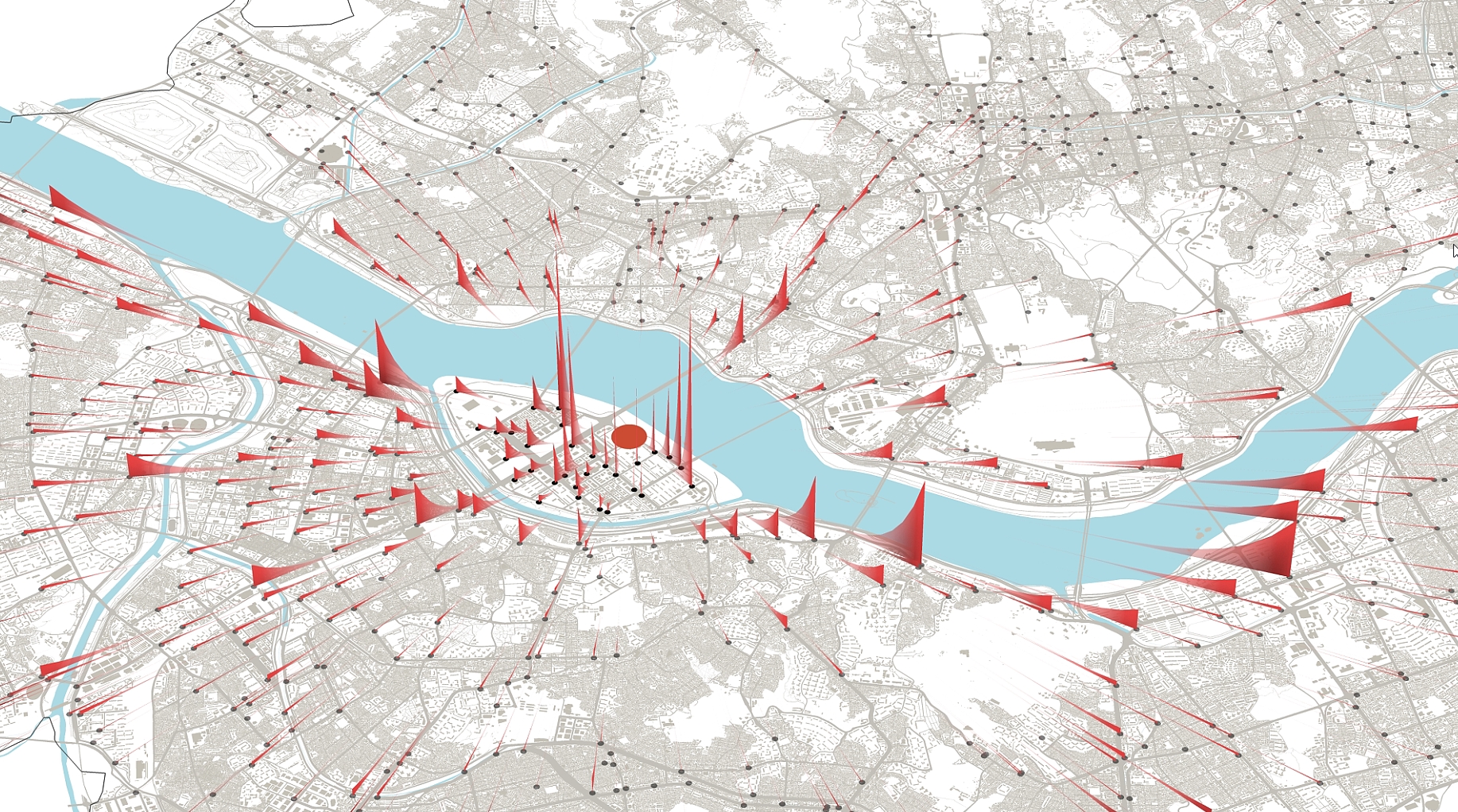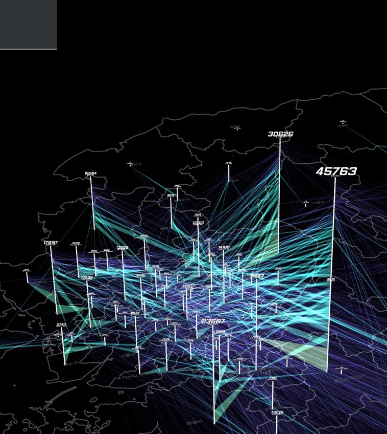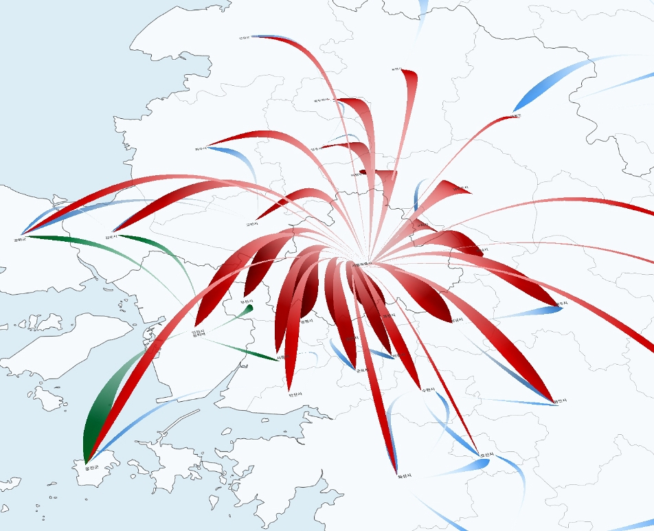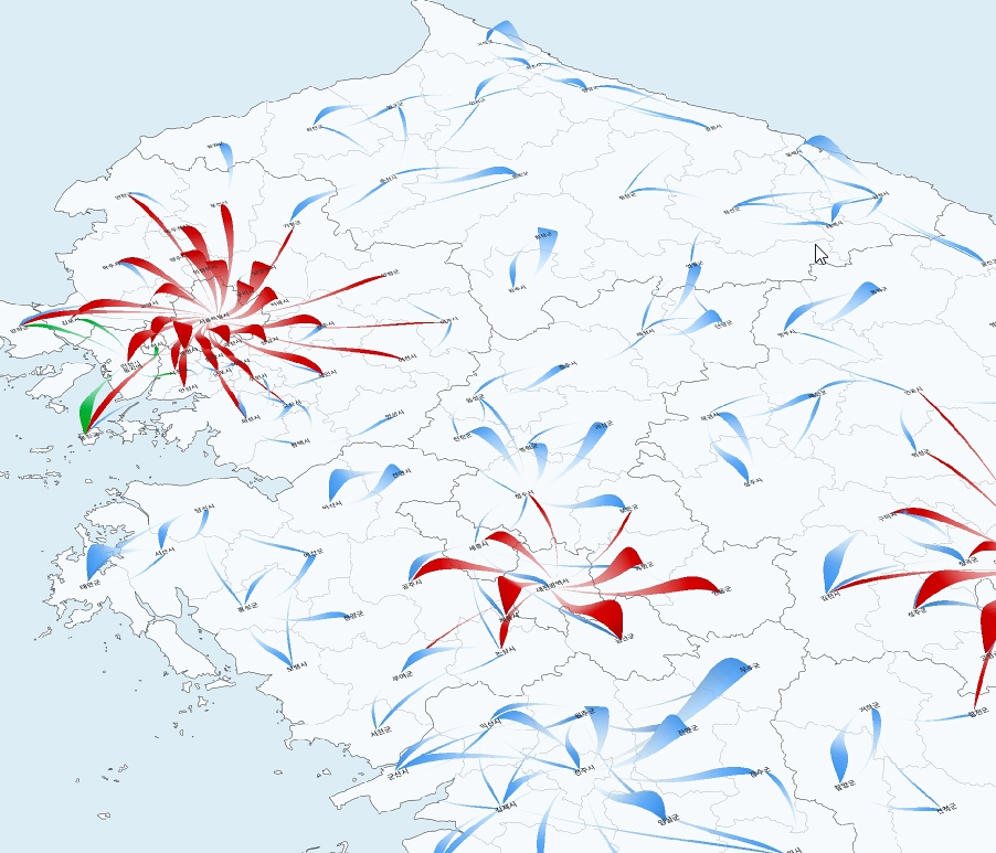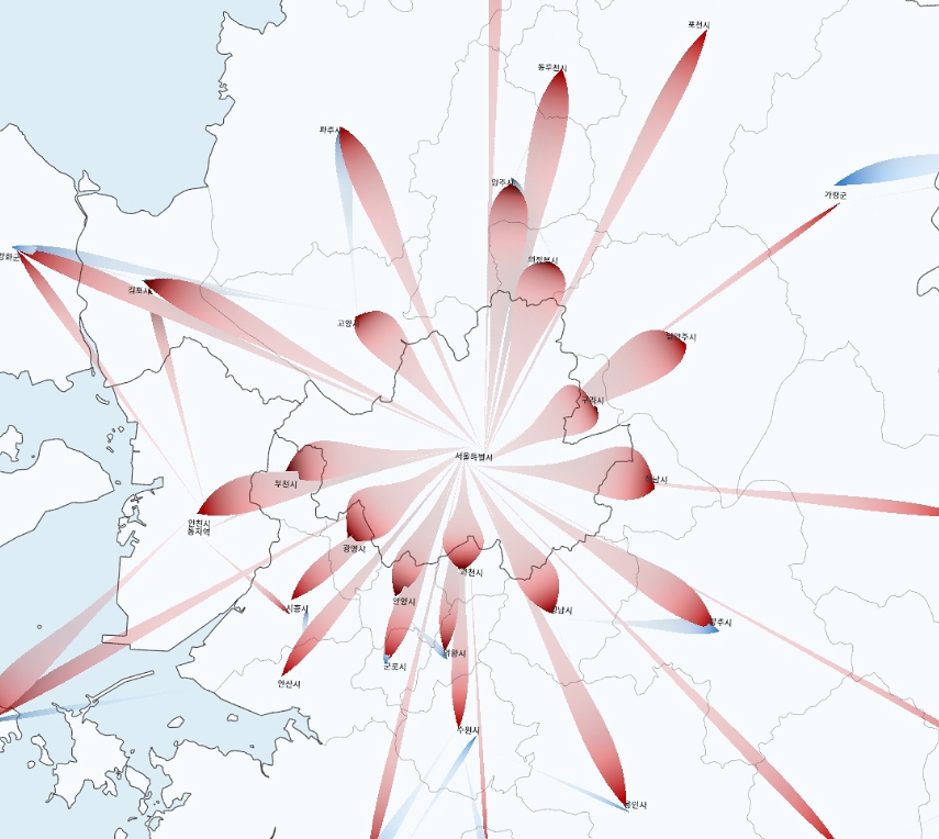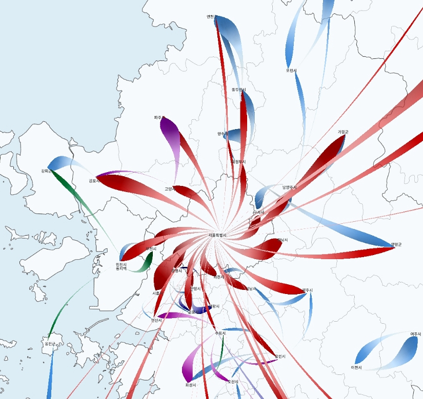 언제나 가까운 곳의 이동량이 많으므로 처음부터 굵으면 모든 선이 떡이 되어버린다는 문제는 위에서도 한번 언급했다. 그래서 출발할 때는 선을 많이 가늘게 하고, 마지막에만 굵어지도록 했다. 곡선으로도 표현해보고 이런저런 규칙들을 부여했다. 가까운 곳들은 조금 더 휘어가게 만들고, 먼 곳의 경우 많이 휘면 방향성이 약해지는 느낌도 있으므로 멀 때는 덜 휘어가게 해서 서울의 권역을 표시해보았다. 이 이미지가 쓰이지는 못했다. 중간 스터디 과정이다.