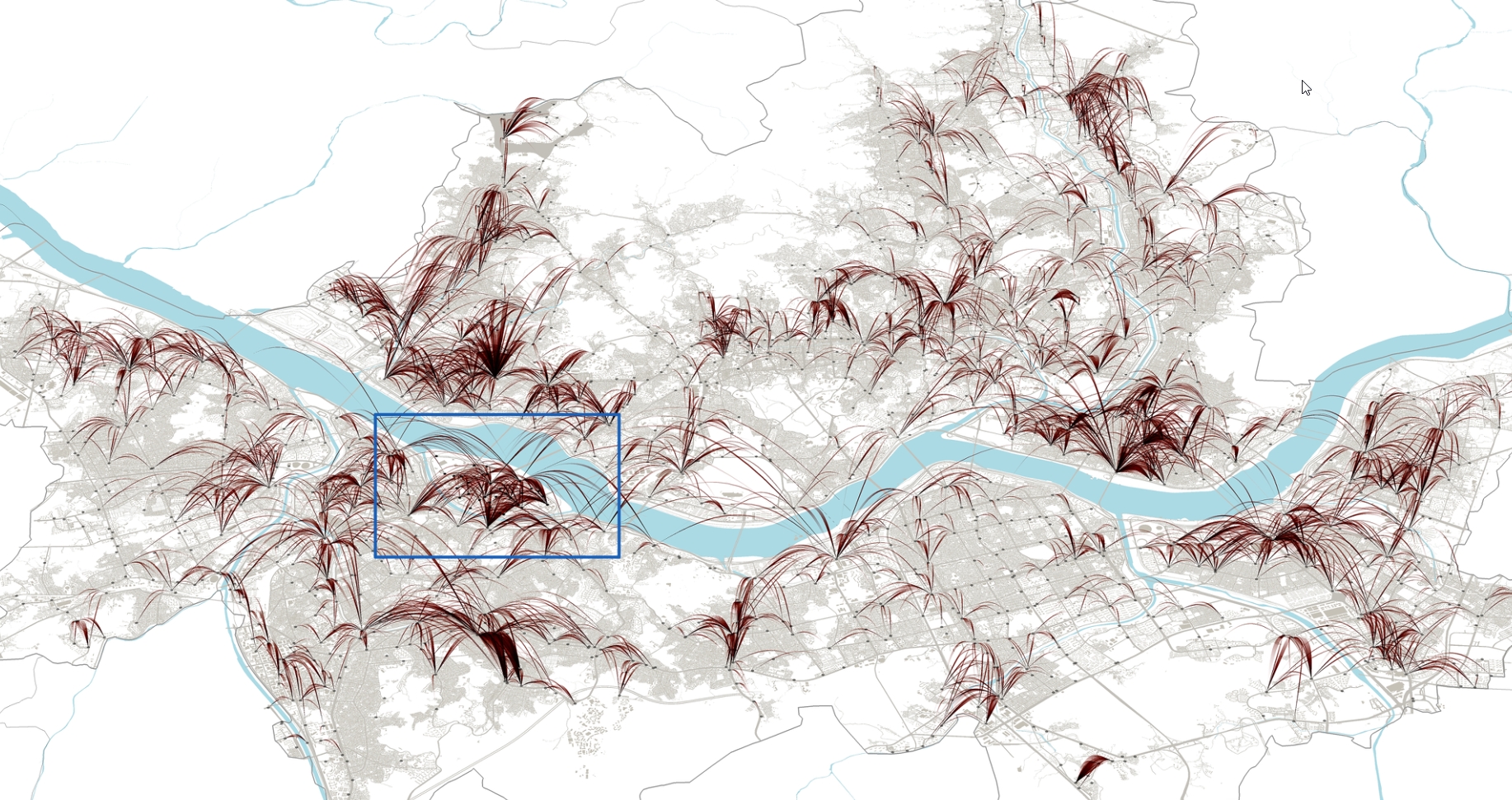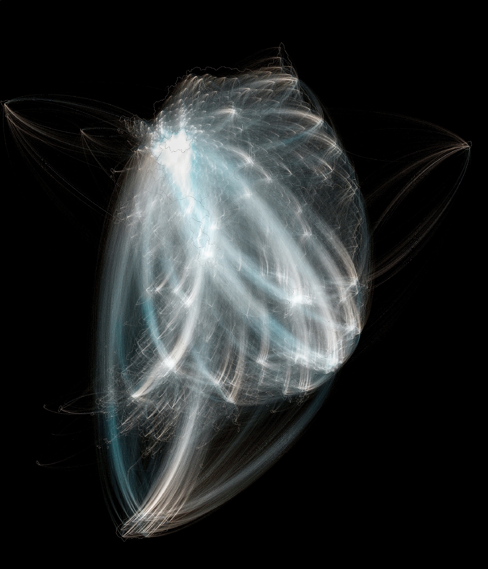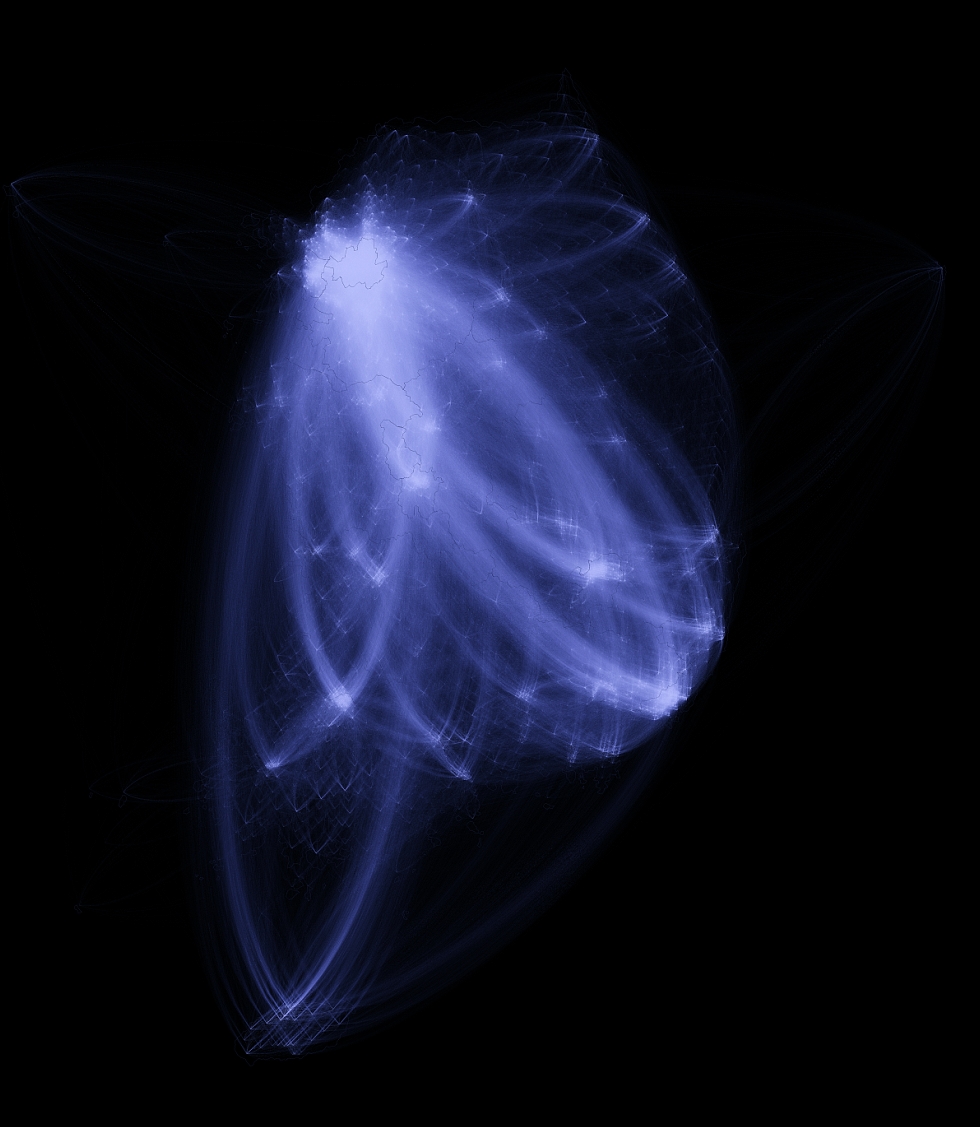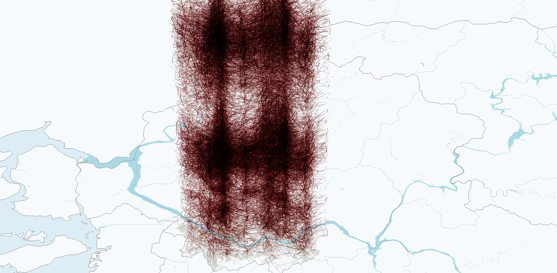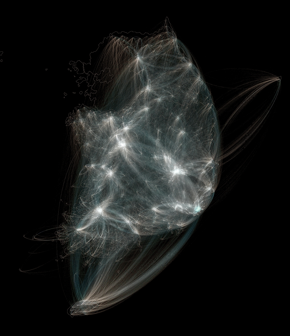 지도 위에 데이터를 표현할 때 아주 까다로운 대상 중 하나는 OD 데이터다. Origin-Destination 데이터는 지도 위의 두 지점을 선으로 이어야 한다. 노드와 링크가 있는 추상공간 위의 네트워크 시각화와는 조금 다른데, 되도록이면 정점의 위치를 움직이지 않음으로써 실제 지리 공간의 거리를 유지해야 한다는 전제가 있기 때문이다.