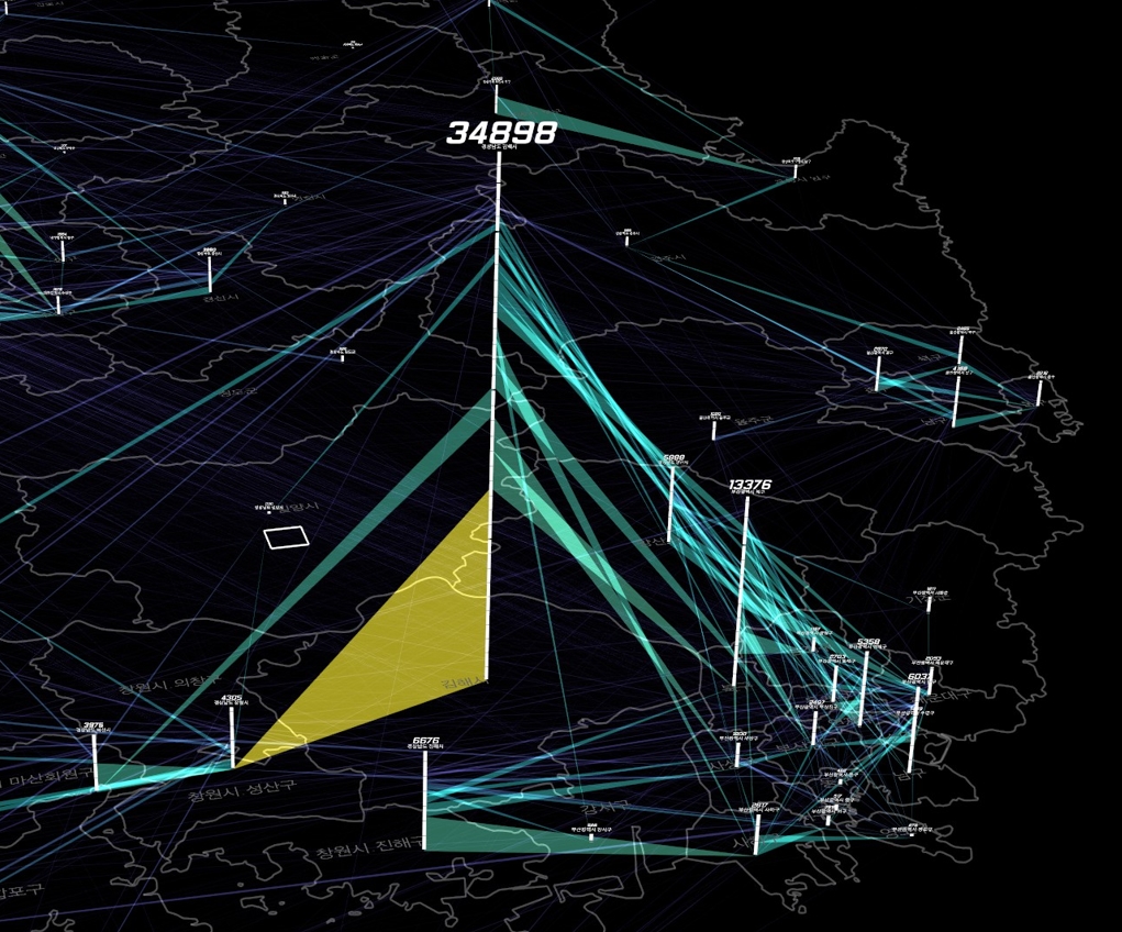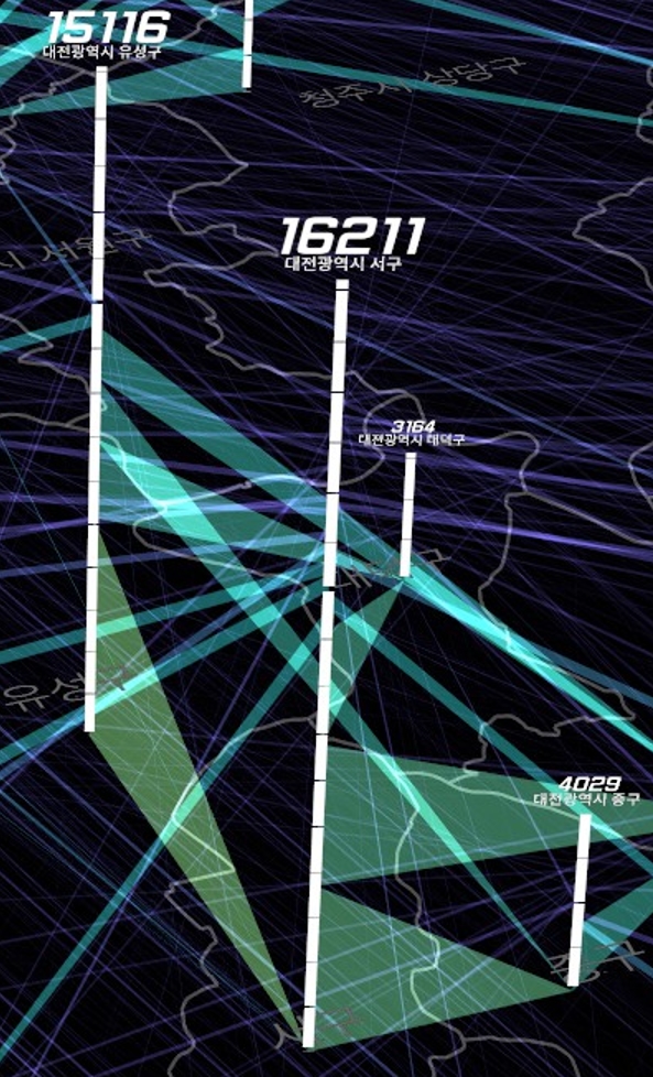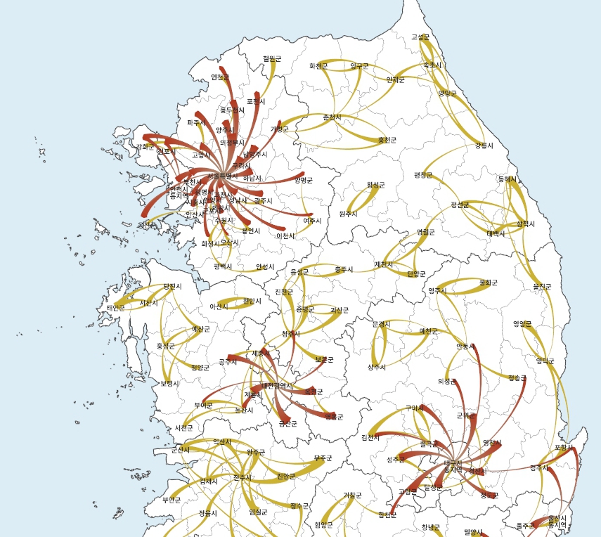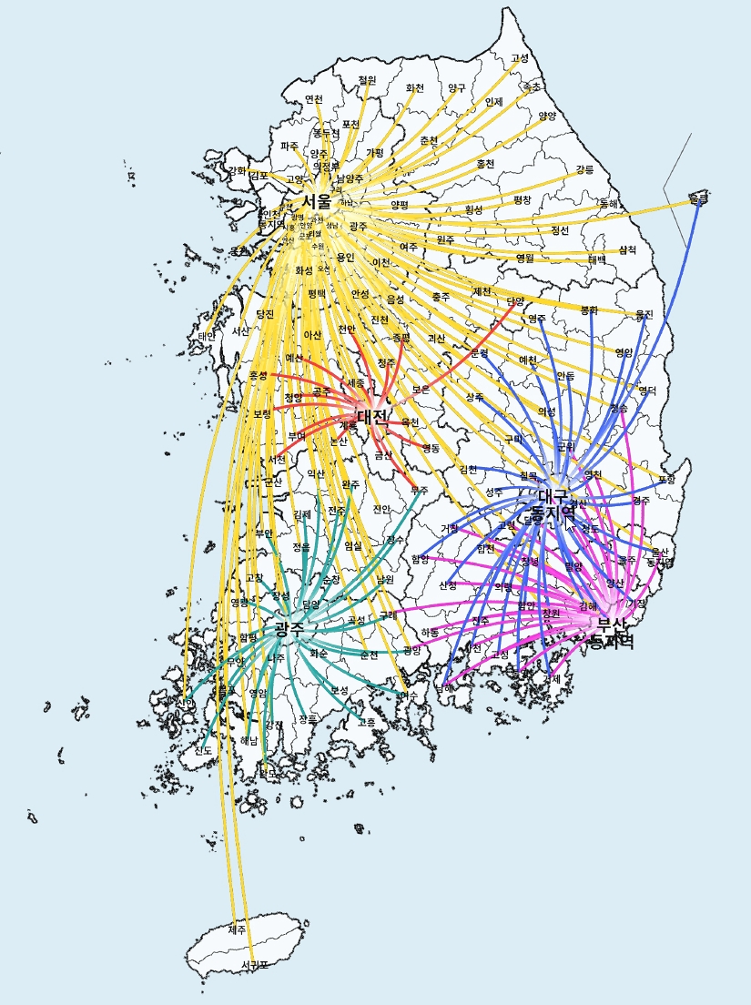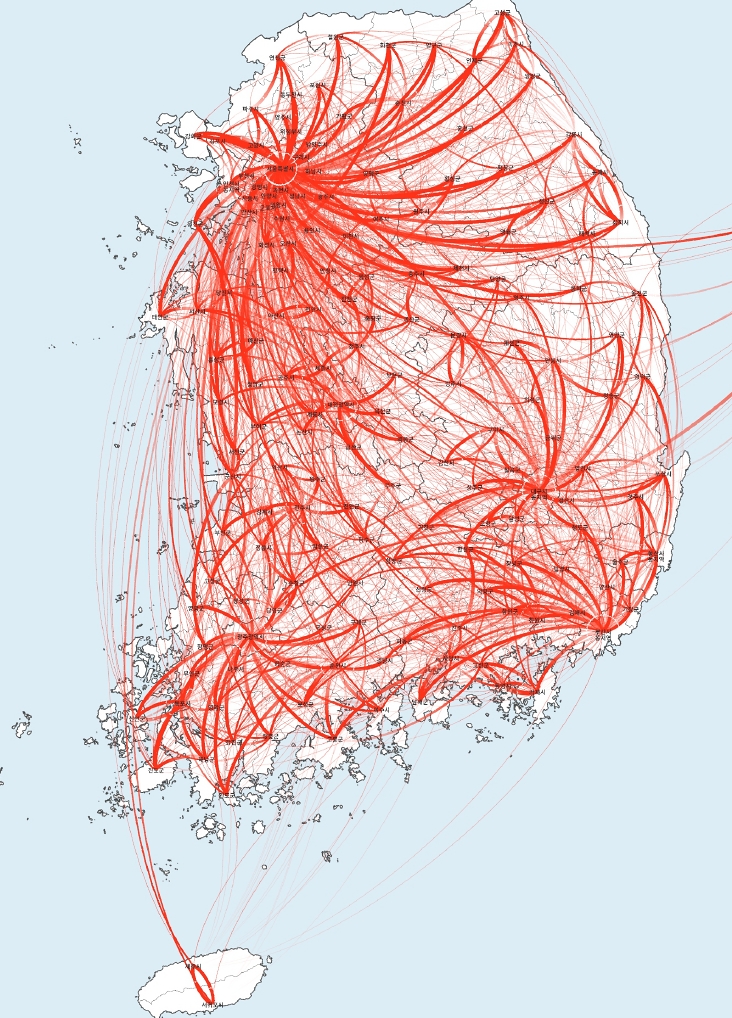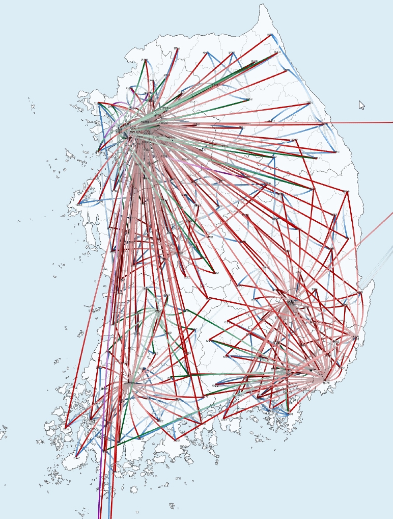 구체적인 내용 하나하나는 확인이 어렵다. 다만 서울과 그 주변 수도권을 기종점으로 한 이동이 지배적이라는 점이 보인다. 사실 딱 거기까지다. 부산 대구 등 지방 곳곳의 허브들이 분명히 있는데, 그것은 이 그림에서 잘 드러나지 않는다. 지역의 허브를 보고 싶으면, 수도권을 기종점으로 둔 이동을 지워보면 된다. 아래 그림처럼.