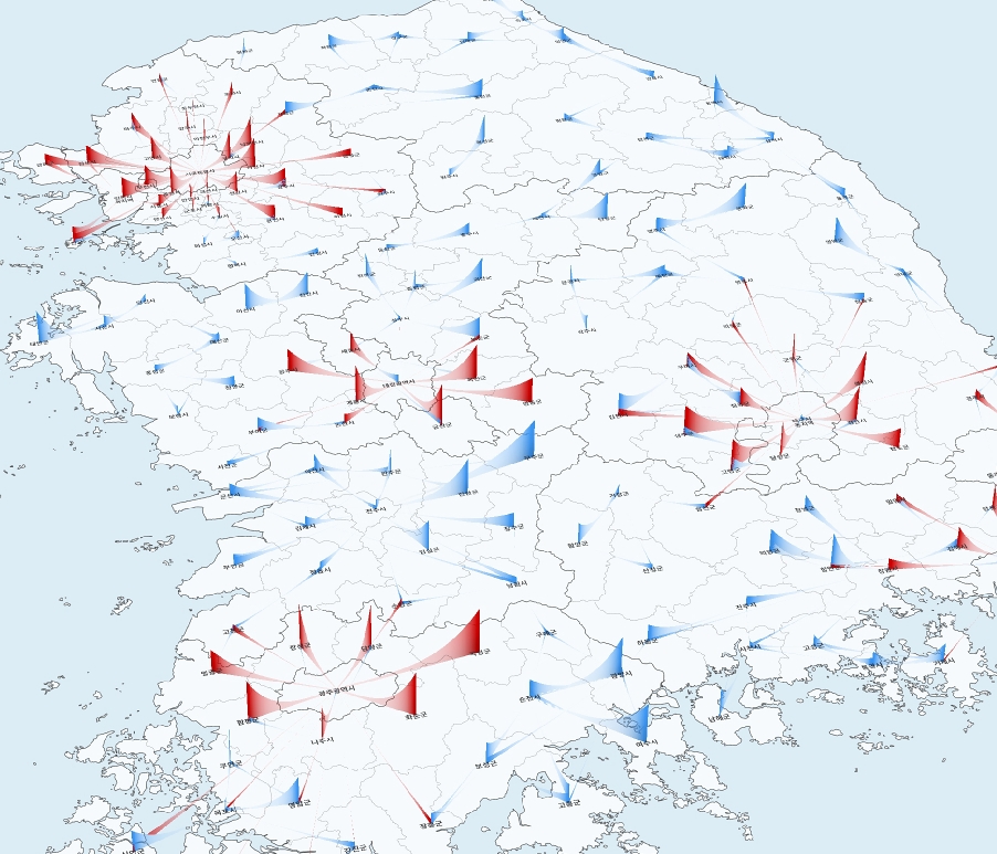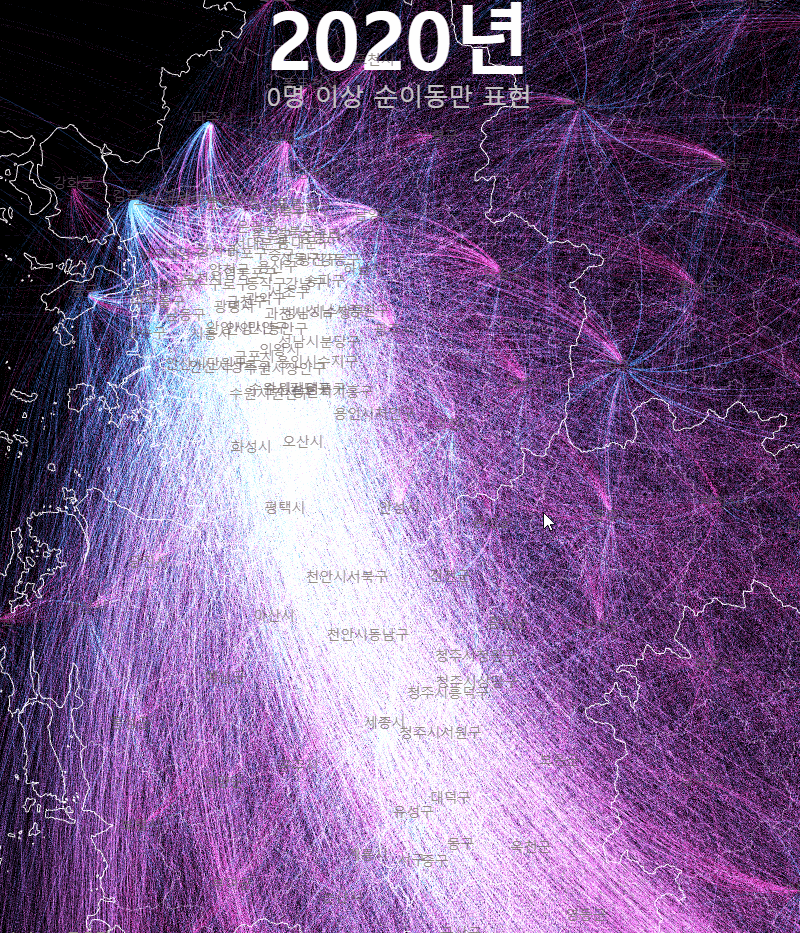 작업을 하다보니 생각보다 이동량이 대칭적이라는 점을 알게 되었다. 결국 오고가는 양의 차이인 순이동량이 서서히 누적되어 전국의 인구 쏠림 현상을 만들어내는 것. 그래서 순이동이 아닌 양뱡향의 표현을 그대로 드러낼 때는 수도권으로 인구가 집중되는 것은 표현하기 어렵다고 결론지었다.