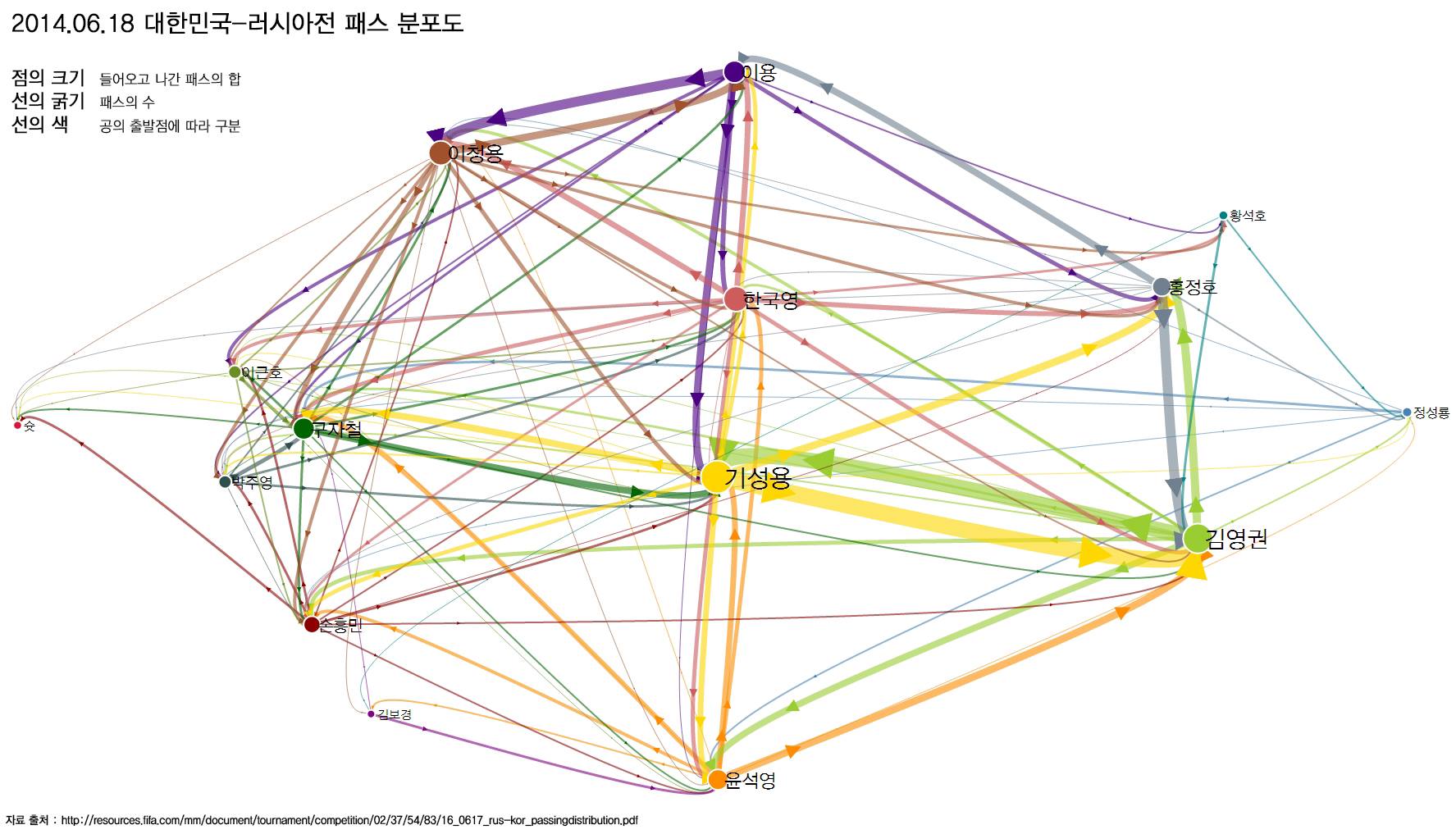 화살표를 좀 더 간단하게 했고, 패스횟수도 추가해보았다. 패스량이 많으면 선도 굵고 숫자도 크게 했다. 기왕이면 공이 패스한 공이 통통 튀기는 것 같은 효과도 넣어보았다. 기사의 링크는 다행히 아직 살아 있다.
