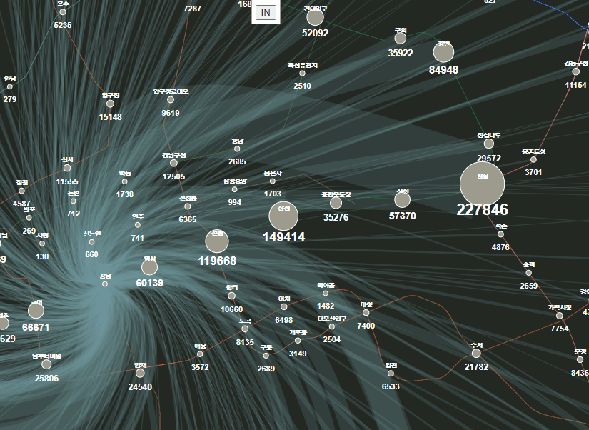 서울시에서 개방하고 있는 역간 월별 승하차량을 이용했는데, 600여개의 노드이기 때문에 한 번에 전체를 보여주는 것은 처음부터 포기했고, 특정 역을 클릭했을 때 나가는 데이터와 들어오는 데이터를 구분해서 표현해야 겨우 무언가 보이는 것 같았다. 존재하는 모든 선을 그리기에는 당시 svg방식을 사용하던 d3.js로는 퍼포먼스의 한계도 있었다.