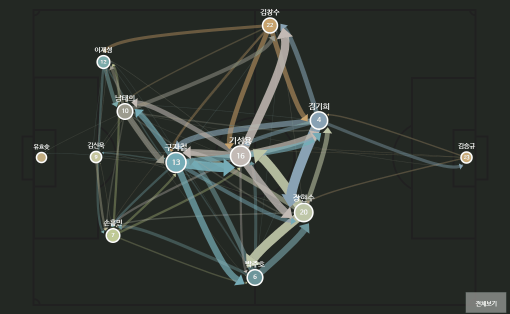 패스 횟수에 따라 선의 굵기를 다르게 했는데, 그 부분이 이 시각화에서 가장 중요한 부분이라 생각했다. 패스 분포는 결국 선수들이 연결된 정도, 혹은 경기가 운영된 흐름을 보여주는 것이라 생각했기 때문이다.