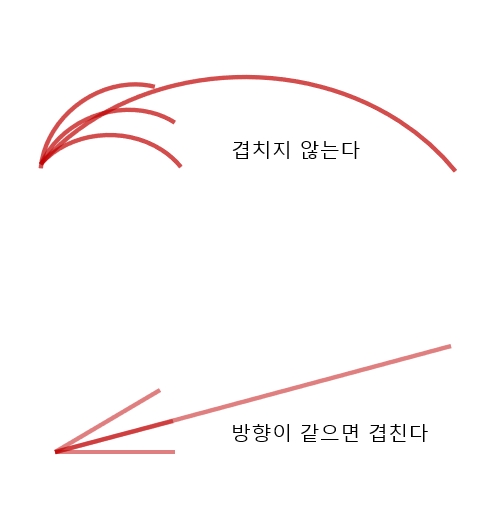 그리고 화살표 중간을 다소 투명하게 했는데, 시작과 끝은 확실하게 보여줘야 출발과 도착을 인지할 수 있었지만, 중간에는 끊기기 않는 흐름만 보여줘도 되었기 때문이다. 중간까지 모두 진하게 하면 그림의 많은 부분에서 화살표가 서로 겹치는 탓에 알아볼 수 없게 되어버렸다.