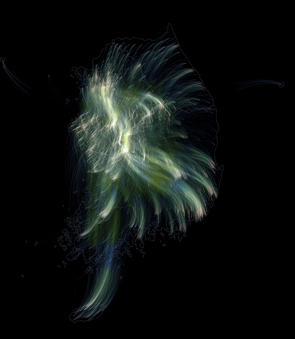 많은 수의 선들을 겹쳐 그릴 때는 색공간이 깊으면 좋다. 일반적인 색공간 즉 한 RGB 각각의 채널당 8비트라면, 결국 아무리 연하게 그려도 255개의 선들이 겹치는 순간 가장 진하게 되어버리기 때문이다. 혹시 각각 256단계이므로 256 x 256 x 256 단계가 되는것이 아니냐 생각할 수도 있다. 물론 픽셀의 색상 수치를 숫자로만 이용해서 무언가 작업을 한다면 당연히 그렇게 된다. 하지만 눈으로 보는 결과물이라면 그렇지 않다. 눈은 그렇게 인지하지 않는다.