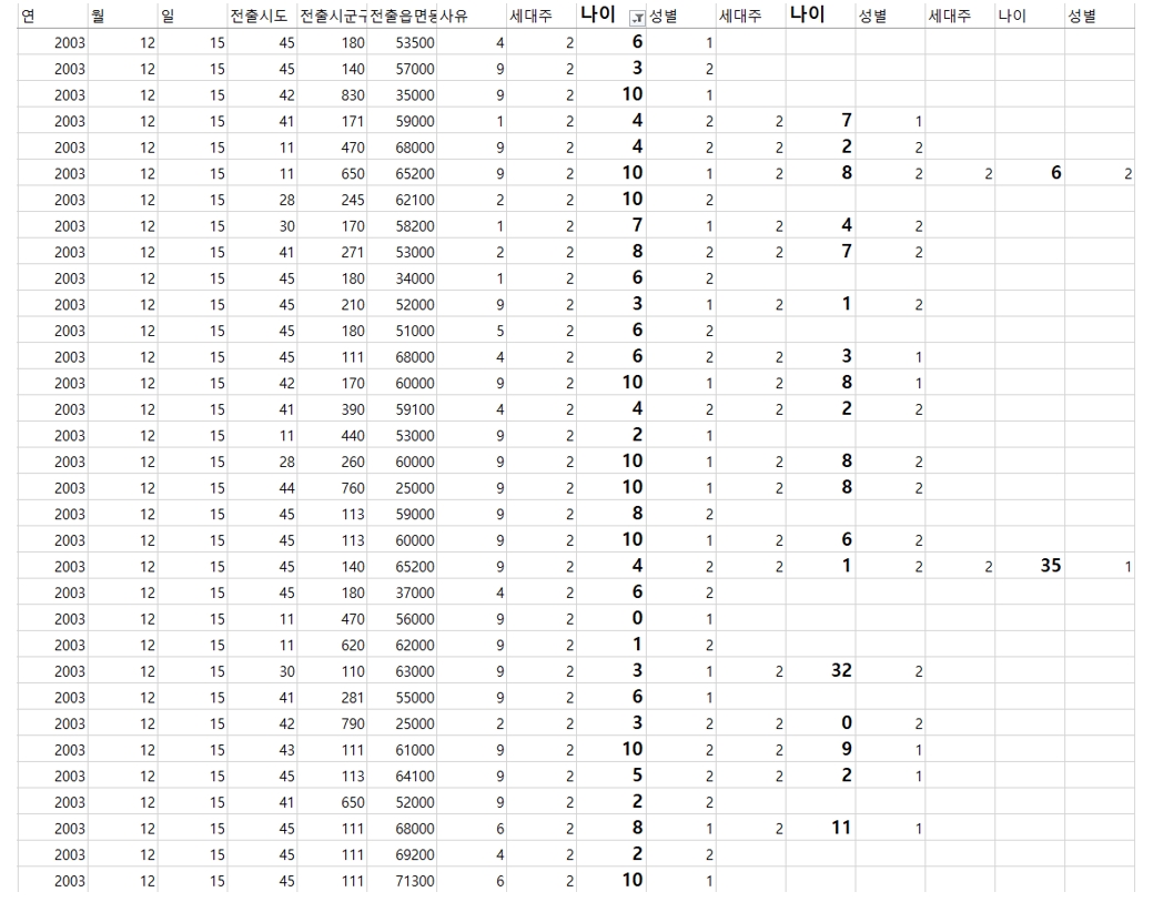 2003년과 2004년을 월별로 집계해보니 위와 같은 말도 안되는 이동이 드러났다. 12월에 23000명이 어디에선가 와서 이듬해 1~3월에 걸쳐 다시 빠져나갔다.