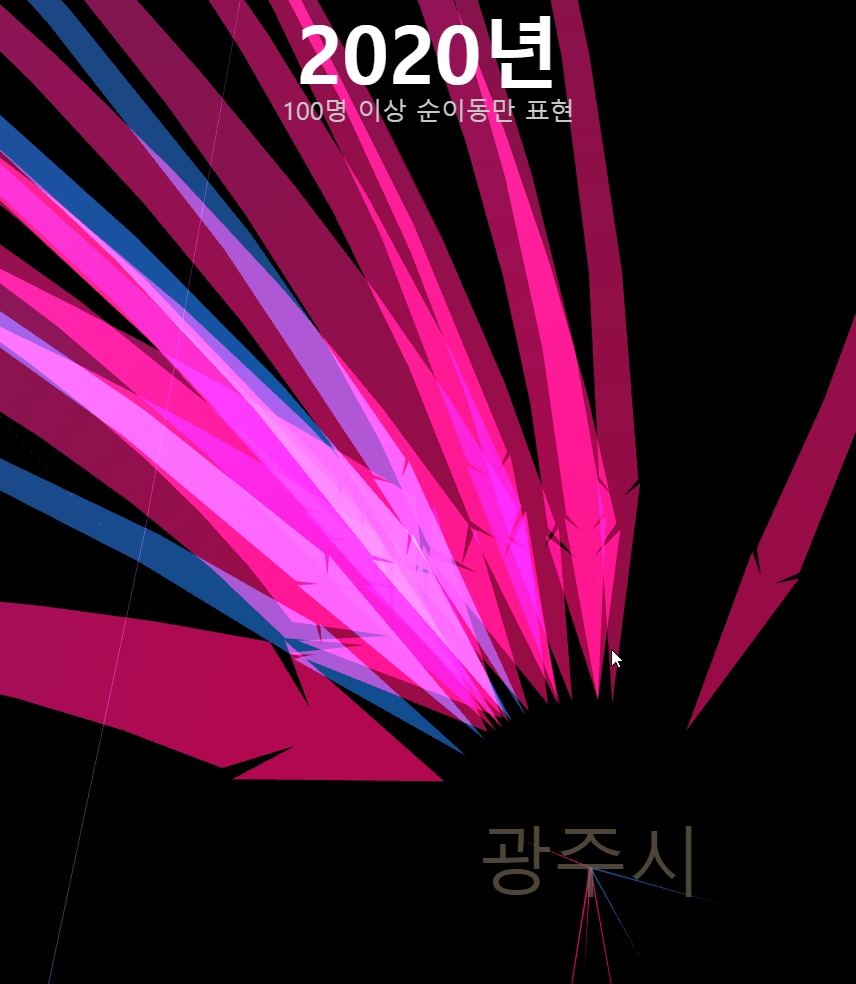 이 인구이동 시리즈는 그 동안 C++/OpenGL로 작업하다가, 그래도 내용상으로 좀 더 공유할 가치가 있다는 생각이 들어 온라인 버젼으로 옮겨보았다. webGL에는 지오메트리 셰이더가 없어서 생각보다 좀 더 고생을 했는데, 여튼 비슷한 수준의 결과물로 바꿔볼 수 있었다.