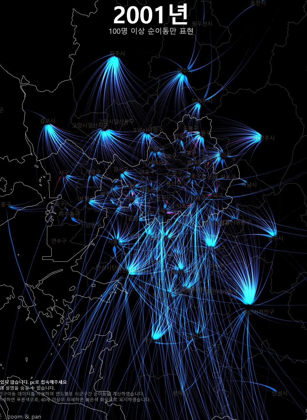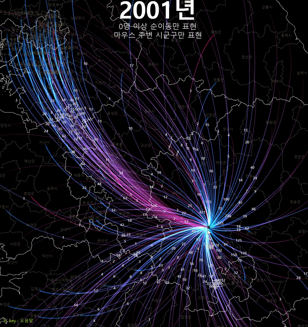 이번에는 대략 10명 이상의 순이동만 보도록 위아래 화살표 키보드를 눌러서 조정하고 z키와 x키로 2001년과 2020년을 번갈아 바꿔보자. 20년 사이에 전국적인 이동의 경향이 어떻게 변했는지 비교해 볼 수 있다.